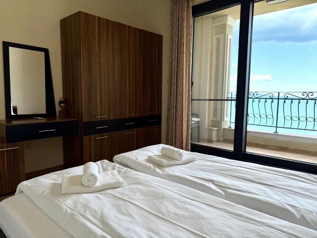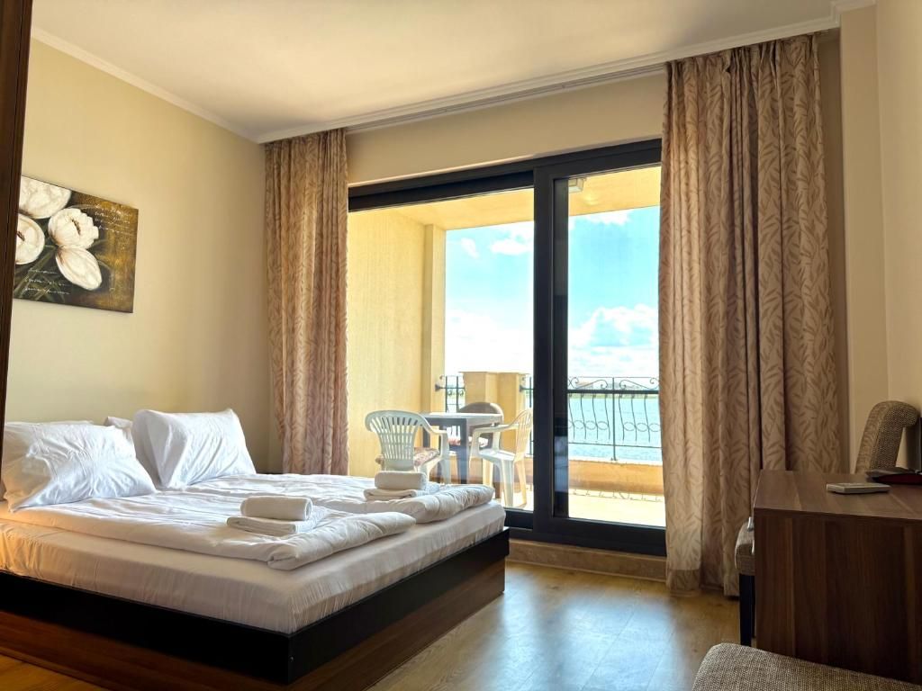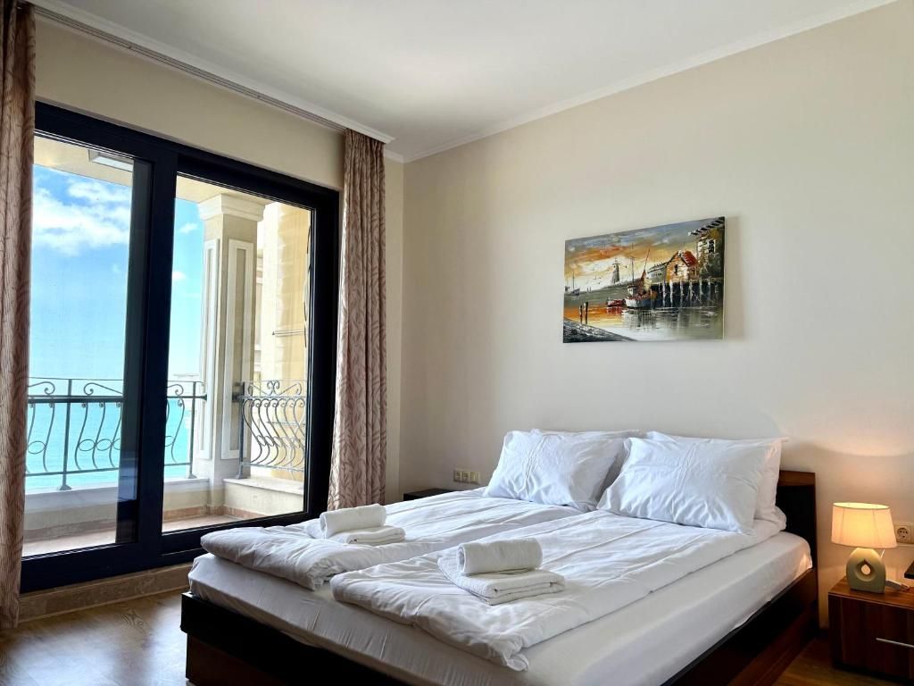 Разположен точно на брега на Поморие, на ивица суша между Черно море и Поморийското езеро, този стилен апартамент на първа линия предлага модерен комфорт и разкошна гледка към морската синева.