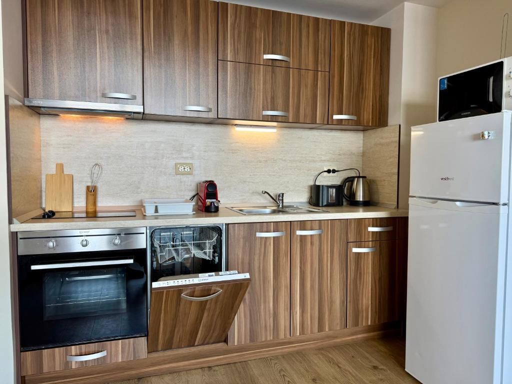 Напълно оборудваната кухня с фурна, котлон, хладилник, пералня и кафемашина дава на гостите свободата да готвят и да се чувстват като у дома си.