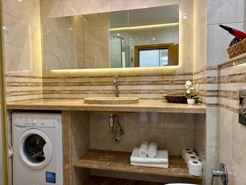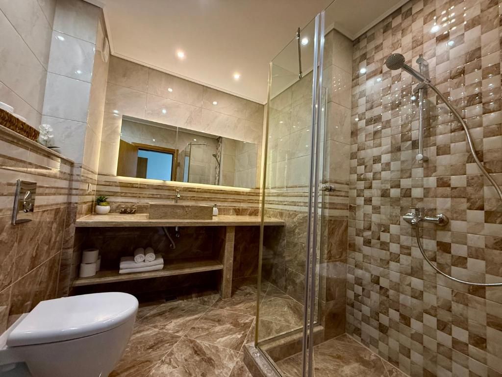 Двете бани са завършени с мраморни плочки, предлагащи душкабини, модерни санитарни принадлежности и внимателно обмислени детайли за допълнителен комфорт.