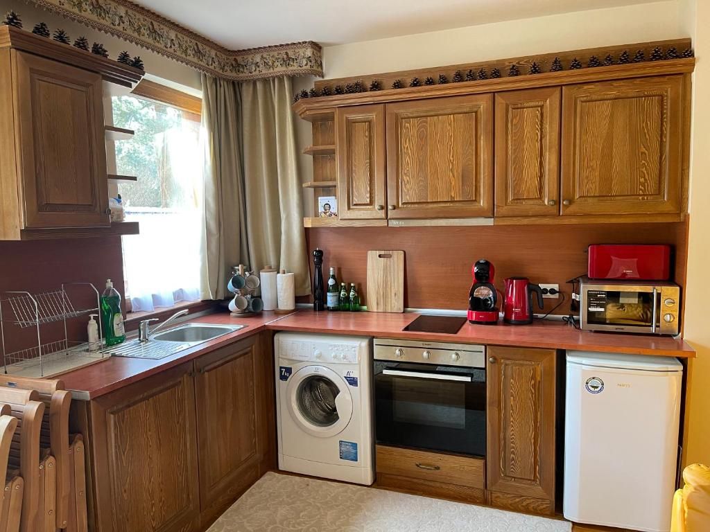 Кухнята е оборудвана с фурна, индукционен плот, хладилник, микровълнова фурна, електрическа кана, тостер, кафе машина, както и с прибори и сервизи за хранене.