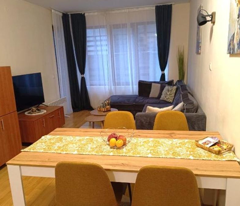 Апартаментът се намира на 300 метра от кабинков лифт Банско, на тихата и спокойна улица Полежан. Като наши гости ще може да се насладите на уютен престой с разнообразни удобства: просторна всекидневна с разтегателен диван, оборудвана кухня, телевизия за релакс и развлечение, кафе машина за аромат и настроение, две спални и тераса.