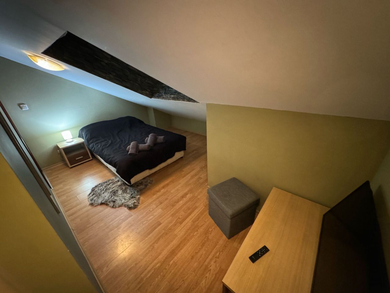 Намира се на последен етаж и предлага характерни скосени тавани, които създават приятна и уютна атмосфера.