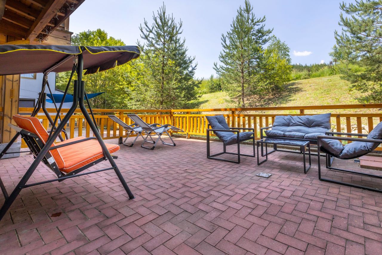 Голяма веранда с изглед към борова гора, удобни дивани и люлка — идеално място за кафе или чаша вино. Наличен е и барбекю кът за готвене на открито.