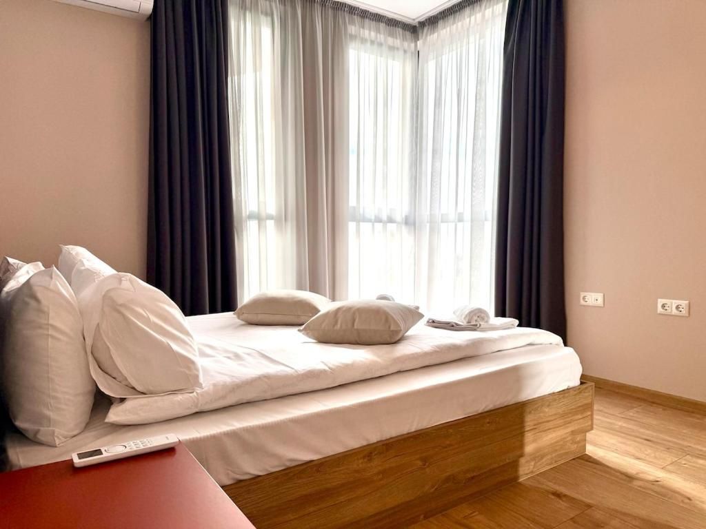 - стилна спалня с бяло спално бельо и затъмняващи завеси, осигуряващи спокоен нощен сън;
