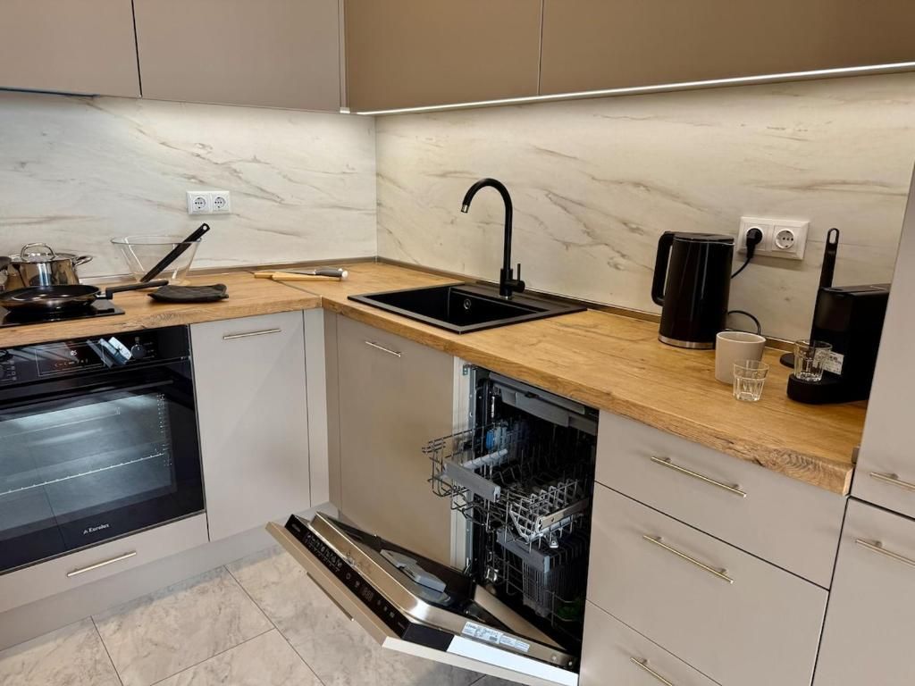 - напълно оборудвана кухня с елегантни шкафове, вградена фурна и котлони и всичко необходимо за приготвяне на домашна храна;