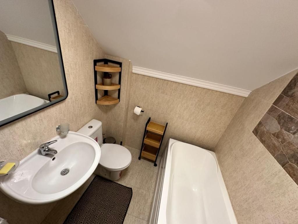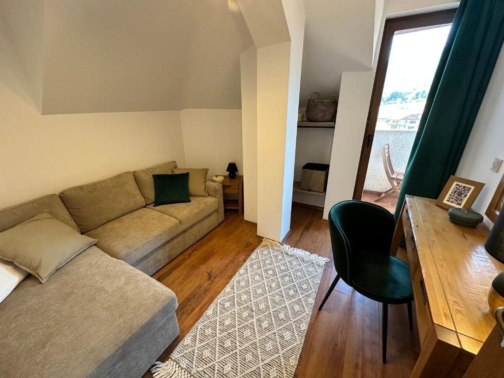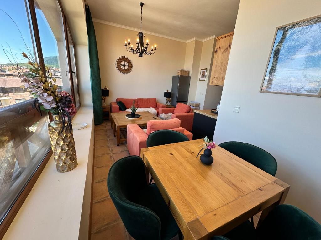 Просторното жилище включва напълно оборудвана кухня с отворен план и комфортна всекидневна с уютна трапезария, подходяща за четирима гости. Има модерна баня с вана, както и удобна допълнителна тоалетна. Главната спалня е обзаведена с две единични легла, тоалетка, гардероб и вентилатор за охлаждане през топлите месеци. Тя също така осигурява директен достъп до балкон с градински мебели, идеални за наслаждаване на зашеметяващата планинска гледка. Втората спалня е внимателно проектирана като офис пространство, което ви позволява да работите комфортно, докато се наслаждавате на престоя си в Банско. Стаята може лесно да се превърне в спалня за гости или деца, разполагаща с разтегателен диван, огледало, за да можете да се приготвите сутрин в собственото си пространство, и собствен достъп до балкона. Всекидневната, обзаведена в топли цветове, е с дървена масичка за кафе и сводест прозорец с панорамна гледка към Банско.