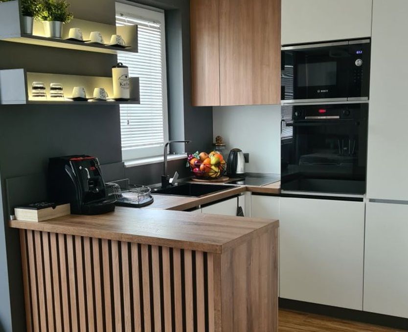Апартаментът е климатизиран и разполага с всекидневна и кът за сядане, 1 спалня, 1 разтегателен диван, телевизор с плосък екран - 2 бр. и кухня, която е напълно оборудвана със съдомиялна машина, електрическа кана, хладилник, микровълнова фурна и вградена фурна.