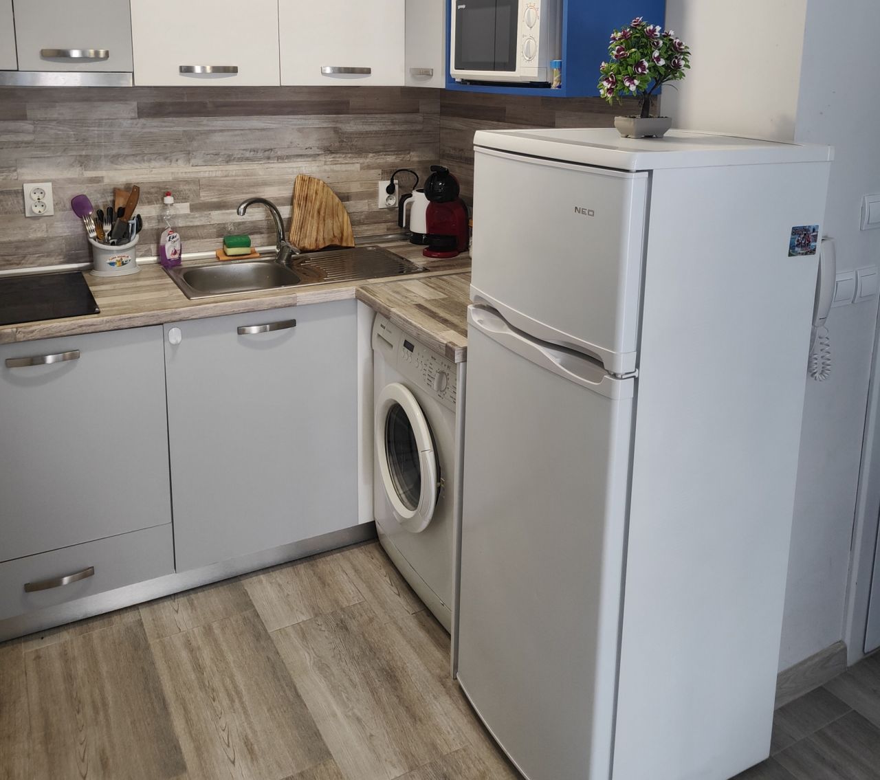 Кухня, която е оборудвана с всичко необходимо (керамичен котлон с тъч сензори, аспиратор, кафе машина, хладилник, пералня, електрическа кана за вода, посуда), спално бельо, хавлии, ютия, две маси, четири стола.