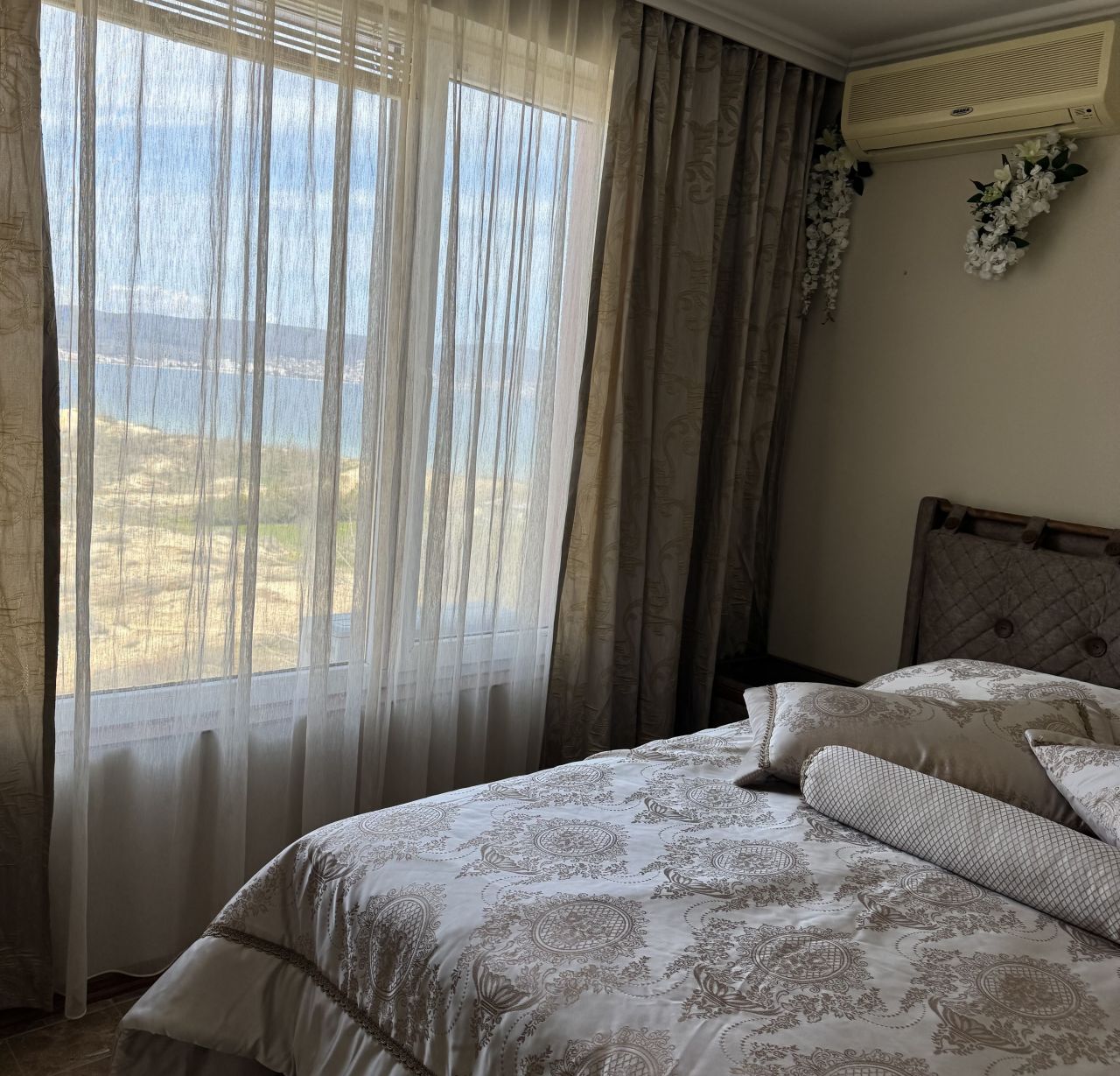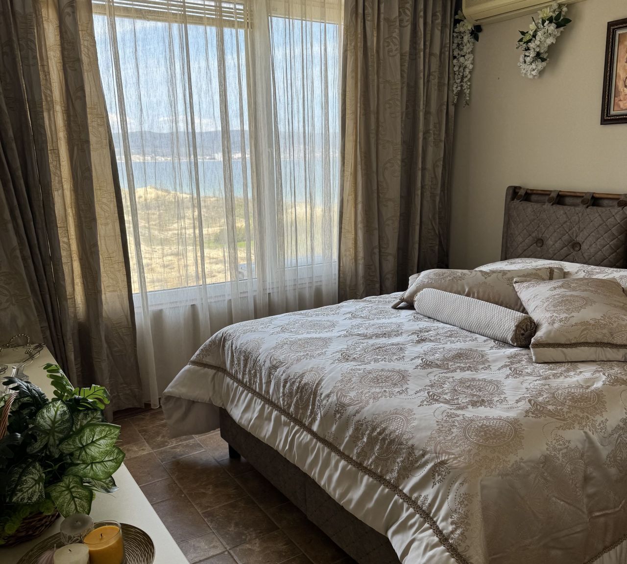 Апартамент в Несебър на първа линия с гледка море. Апартаментът разполага с три просторни спални, напълно оборудвана кухня, кафе машина, ледогенератор, машина за газирана вода и всичко необходимо за вашата незабравима почивка.