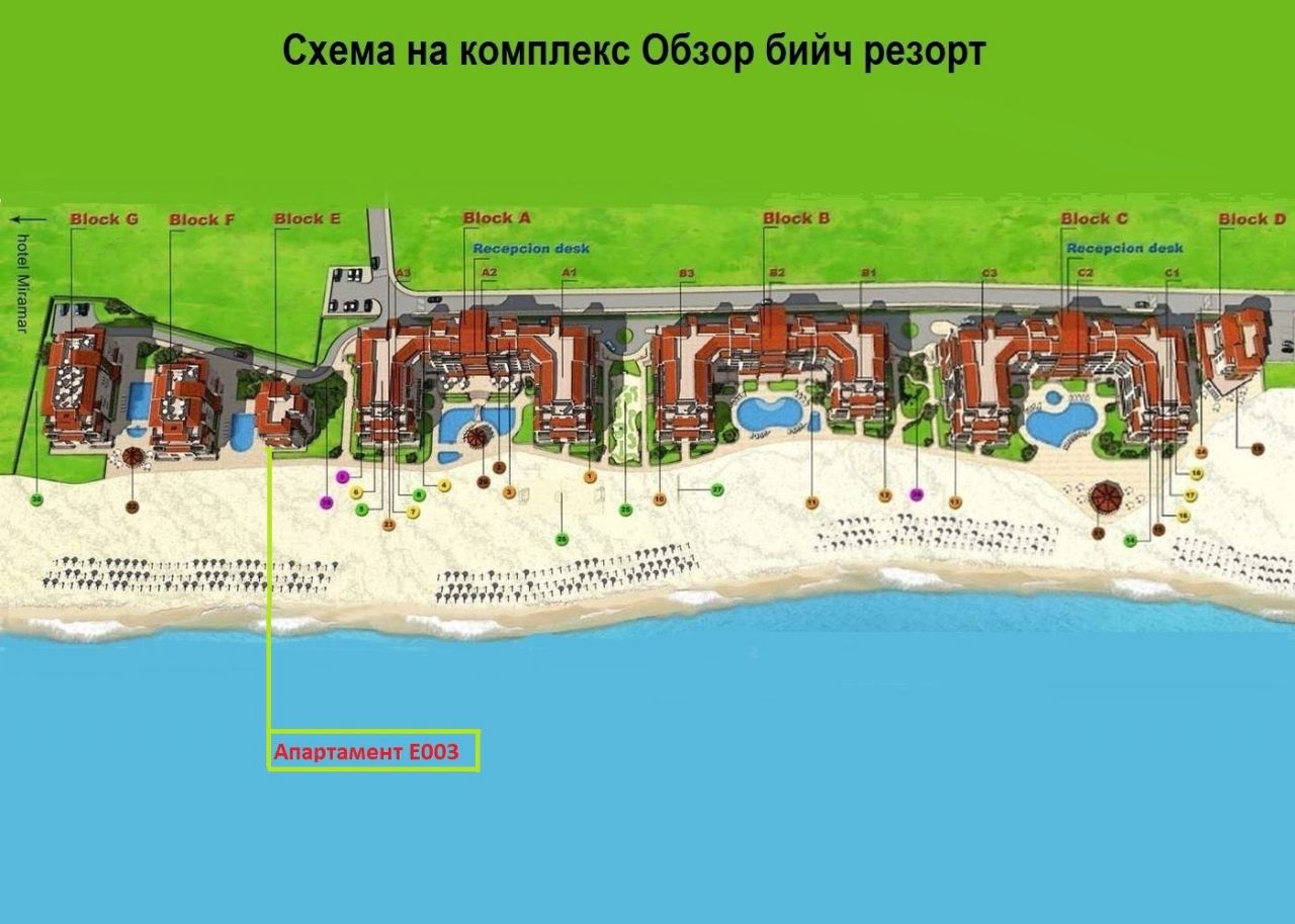 3. Апартамент Е003 на партерен етаж в Обзор Бийч Резорт - Обзор на самия плаж, разстояние - под 10 метро да плажа и басейна.