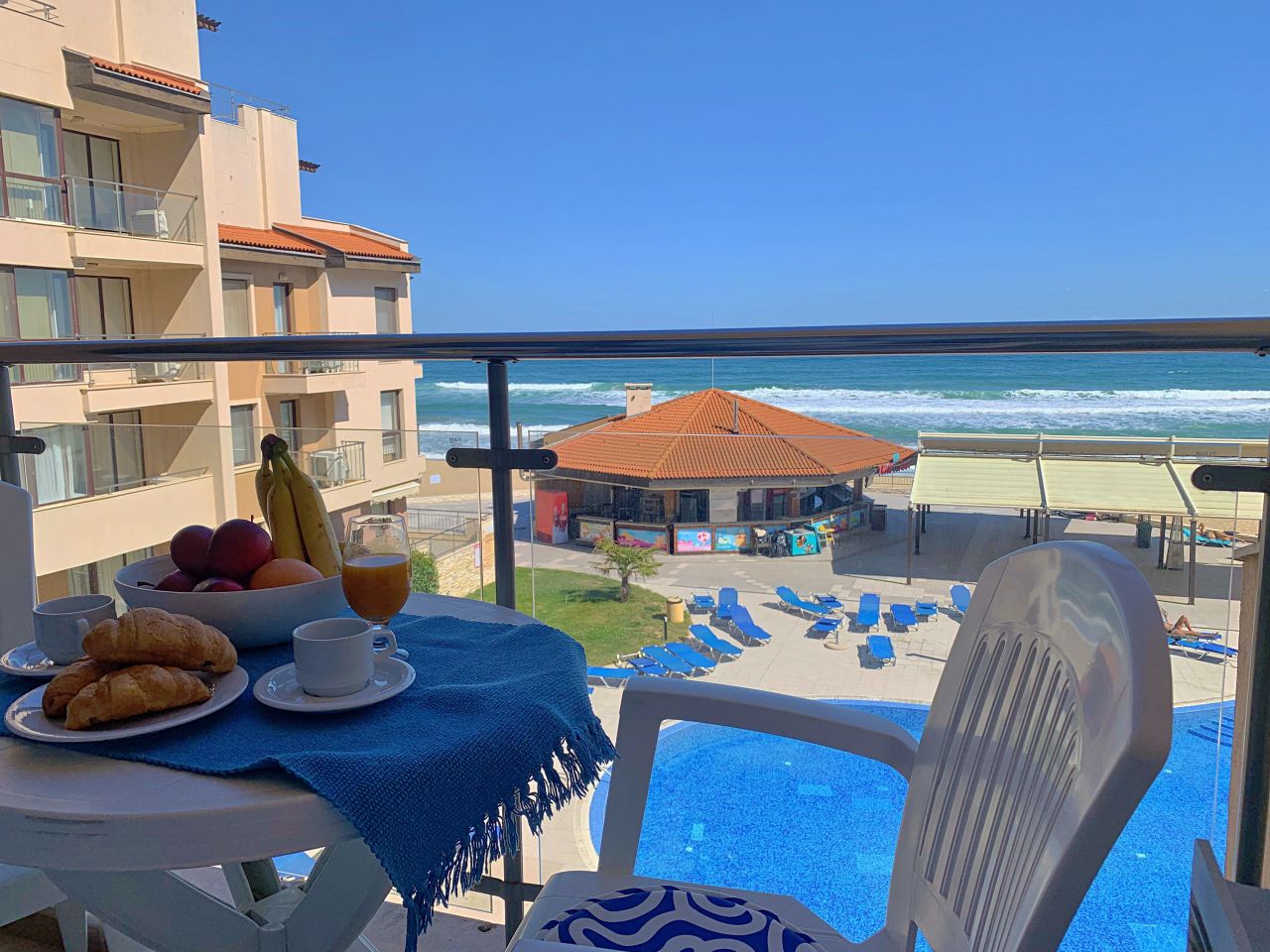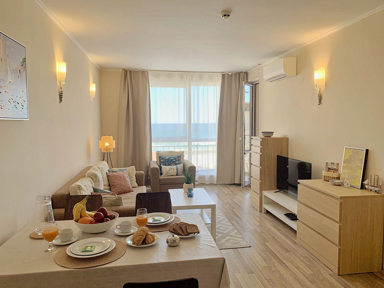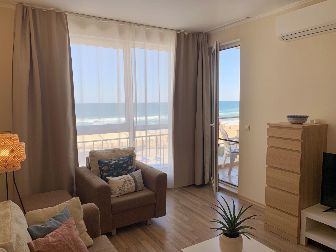 Апартамент Обзор Бийч С203 е луксозен и просторен. Състои се от спалня с двойно легло, гардероб, тоалетка, климатик; луксозен санитарен възел с душ-кабина, мивка и тоалетна. Дневна с разтегателeн диван, където двама души могат да спят комфортно масичка за кафе. На разположение на гостите има модерна, напълно оборудвана кухня с всички необходими съдове и уреди / хладилник с фризер, керамични котлони, микровълнова, кафемашина, тостер, кана за вода/; трапезен кът с маса и столове за хранене. Климатик в хола. От трапезарията се излиза на прекрасна тераса с красив изглед към морето и басейна, оборудвана с маса и столове. Апартаментът е подходящ за 2-ма, максимум 4-ма души. Може да бъде предоставена и детска кошара /при предварителна заявка и срещу допълнително заплащане/. Апартаментът е просторен и светъл, с красива гледка към брега на морето.