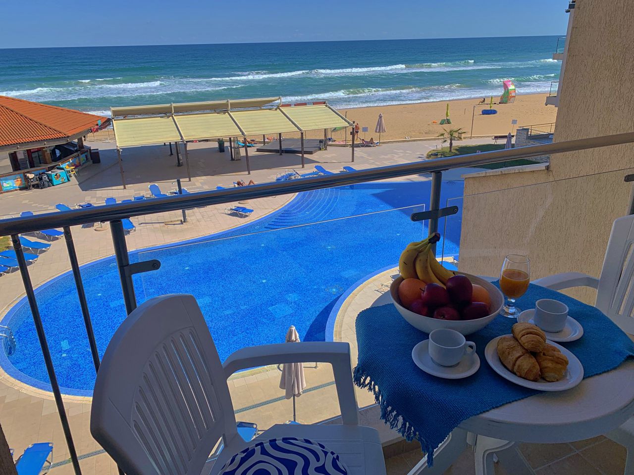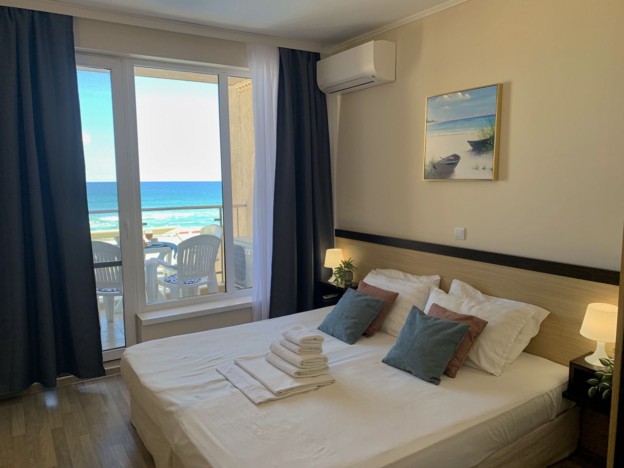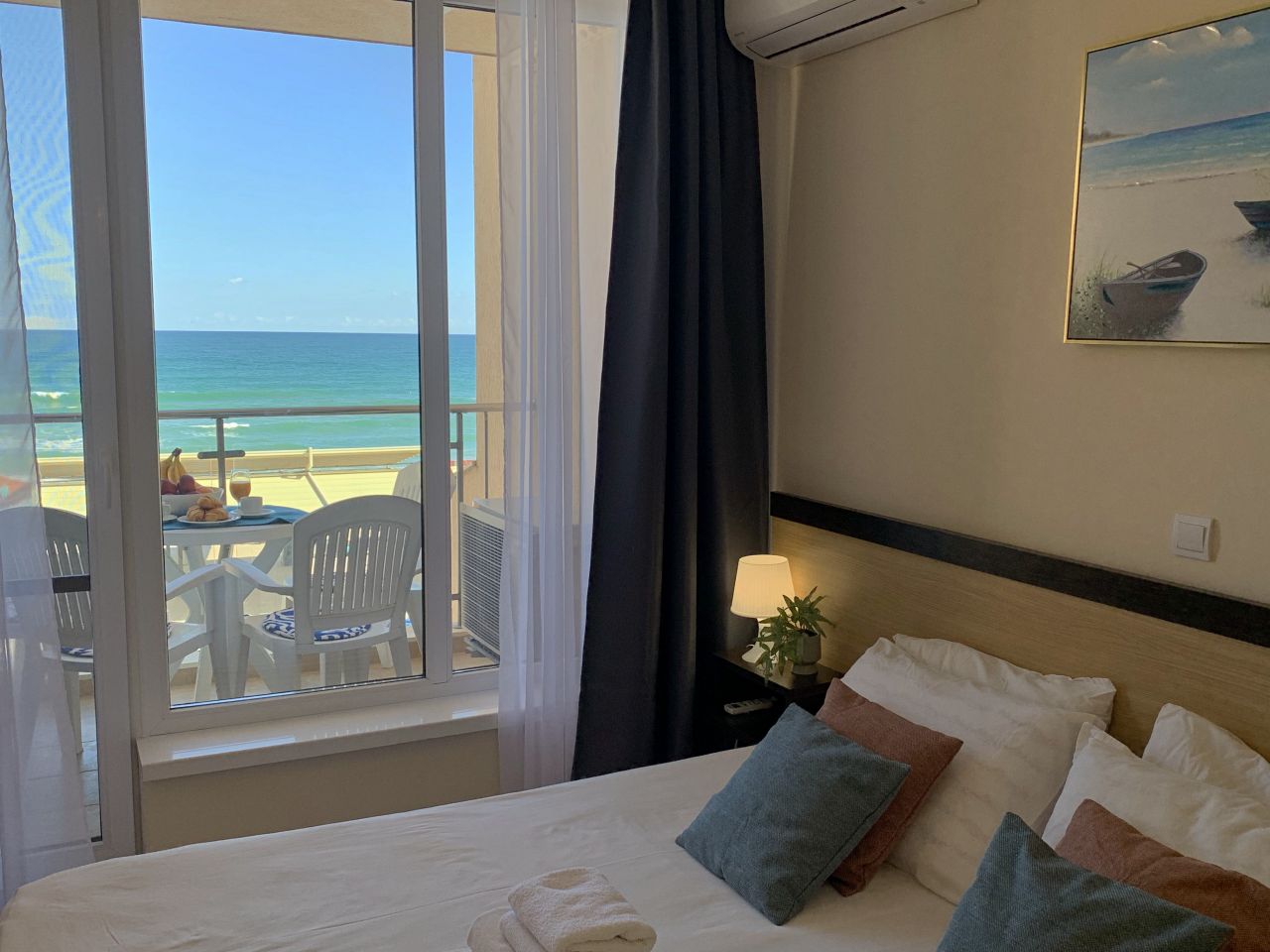 Апартамент Обзор Бийч С203 е луксозен и просторен. Състои се от спалня с двойно легло, гардероб, тоалетка, климатик; луксозен санитарен възел с душ-кабина, мивка и тоалетна. Дневна с разтегателeн диван, където двама души могат да спят комфортно масичка за кафе. На разположение на гостите има модерна, напълно оборудвана кухня с всички необходими съдове и уреди / хладилник с фризер, керамични котлони, микровълнова, кафемашина, тостер, кана за вода/; трапезен кът с маса и столове за хранене. Климатик в хола. От трапезарията се излиза на прекрасна тераса с красив изглед към морето и басейна, оборудвана с маса и столове. Апартаментът е подходящ за 2-ма, максимум 4-ма души. Може да бъде предоставена и детска кошара /при предварителна заявка и срещу допълнително заплащане/. Апартаментът е просторен и светъл, с красива гледка към брега на морето.