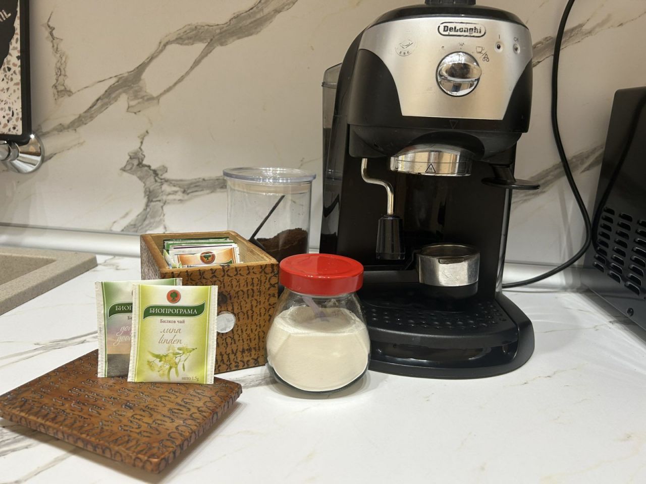 Апартаментът включва една спалня, хол с кухня, баня и тераса. Отлично оборудвана кухня разполага с хладилник, готварска печка, котлон, абсорбатор, микровълнова, съдомиялна машина, кафе машина, електрическа кана, блендер. Чаши, чинии, прибори и съдове за приготвяне на храна.