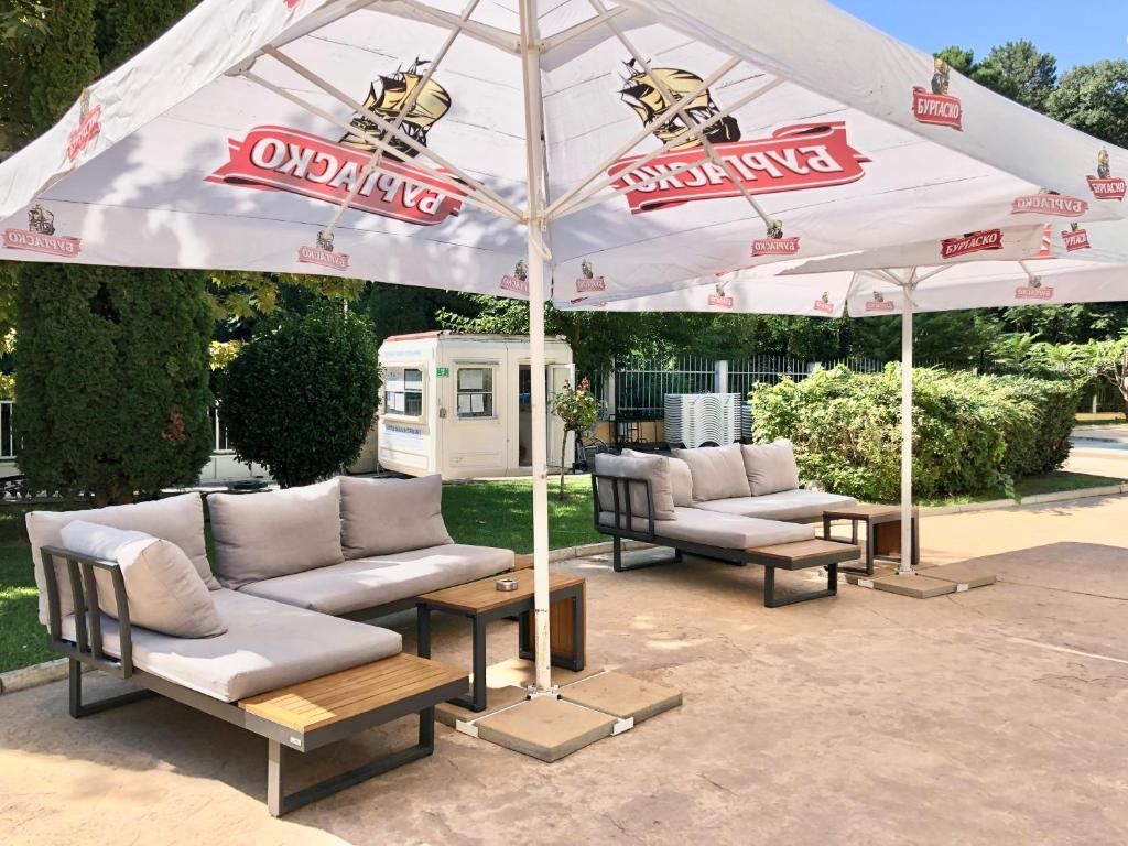 Басейнът е голям, с детска част, а от терасата се открива красива гледка към него.
