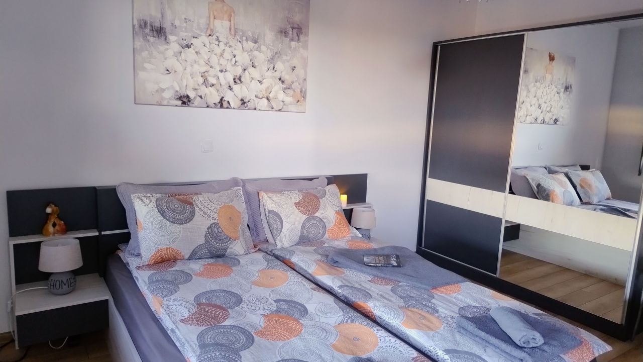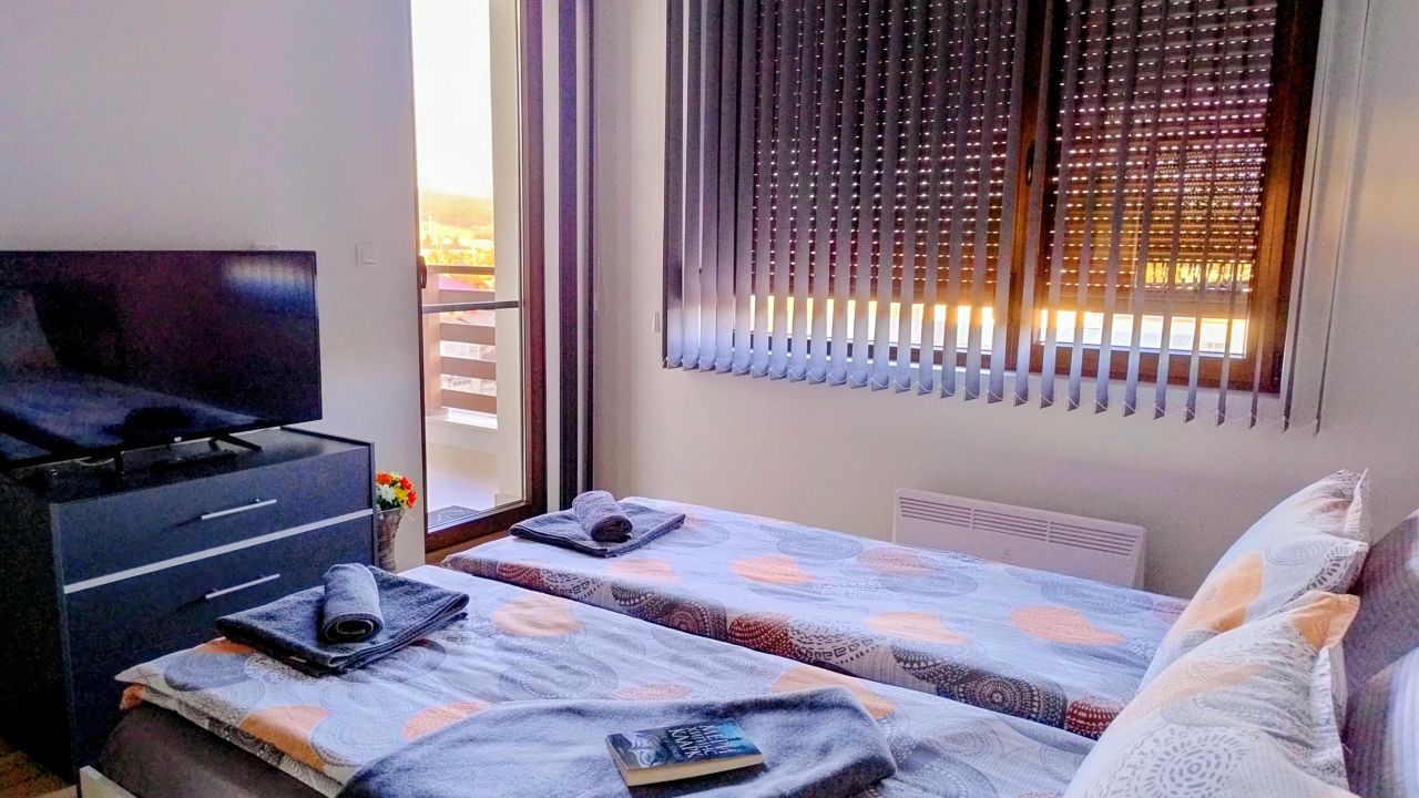 Апартаментът разполага със спалня, плоскоекранен телевизор, тераса и кът за отдих.