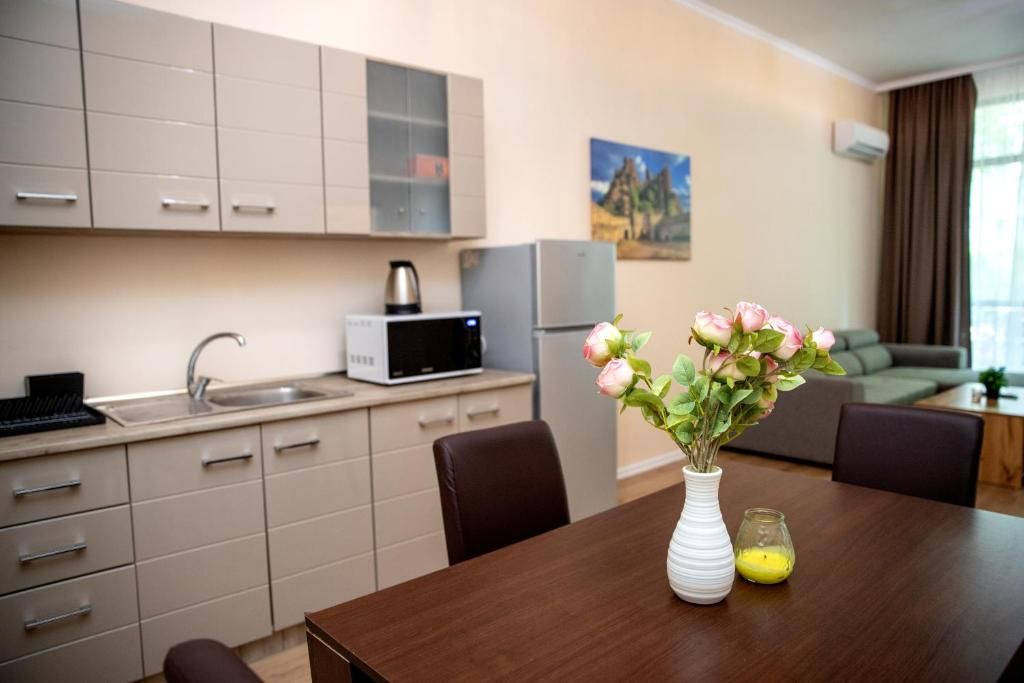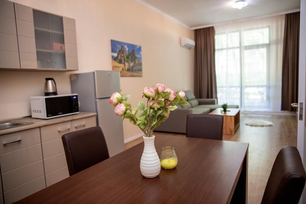 Жилището е комфортно и уютно обзаведено и разполага с просторна всекидневна с кът за хранене и оборудван кухненски бокс, една спалня, климатик, телевизор, безплатен Wi Fi, тераса и санитарен възел.