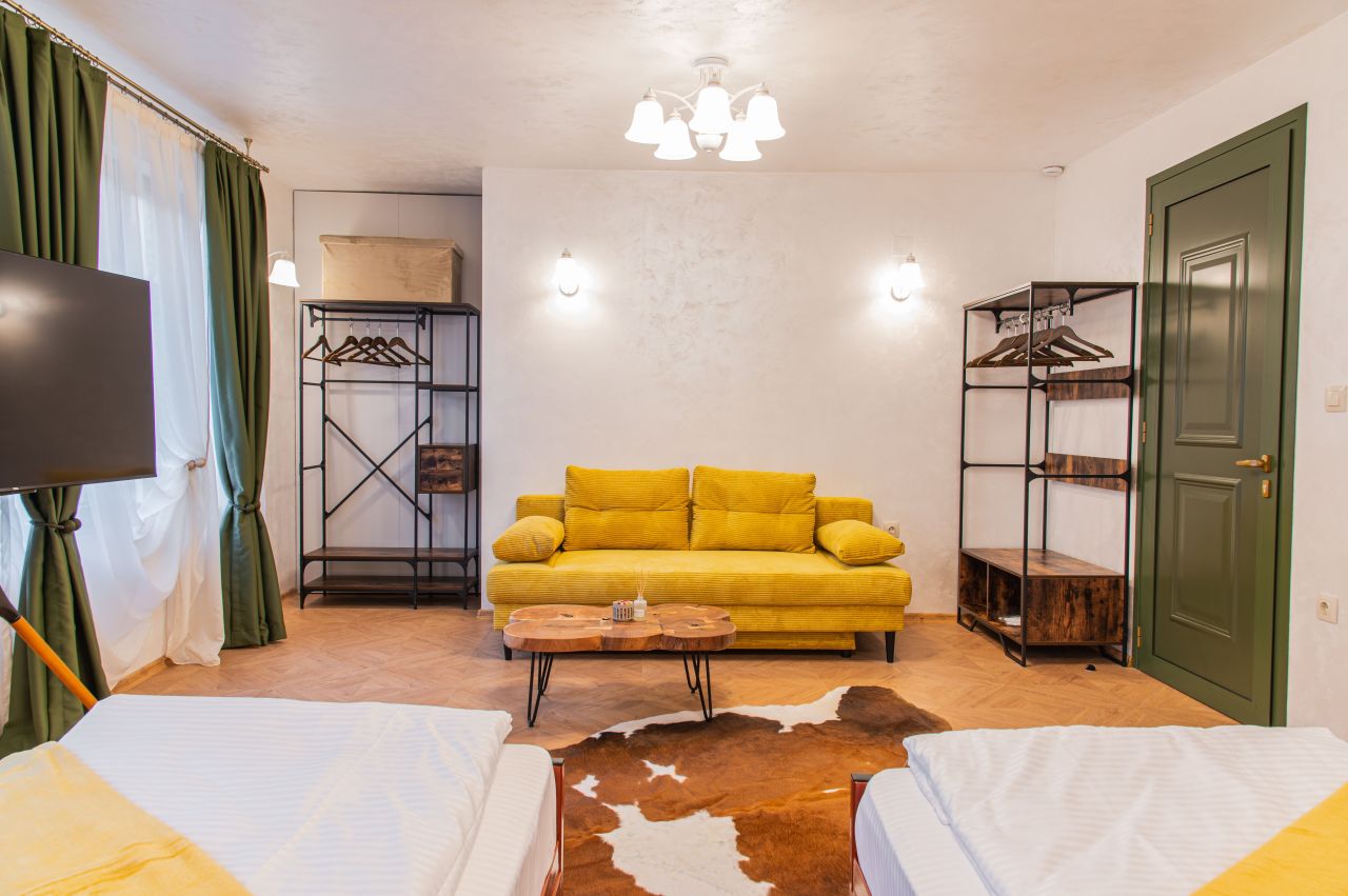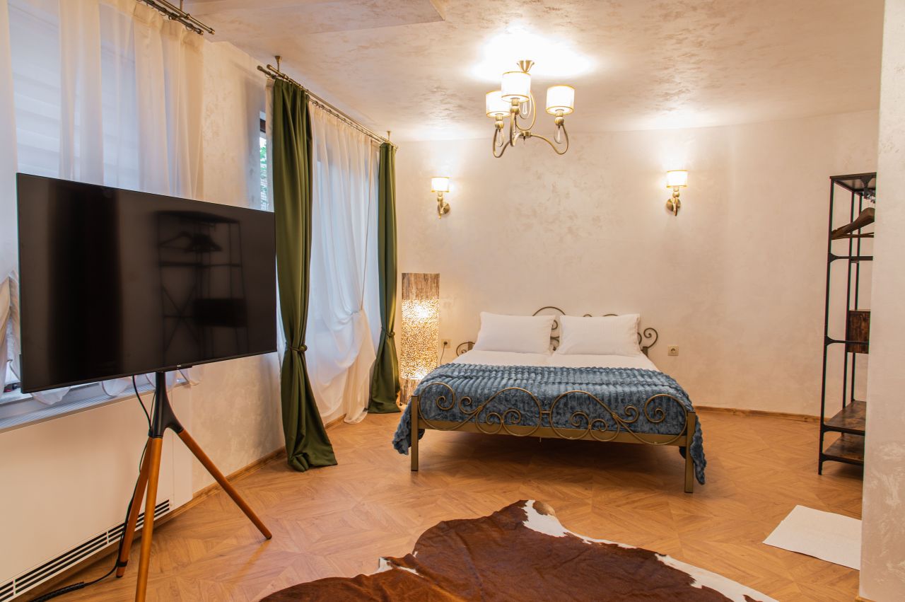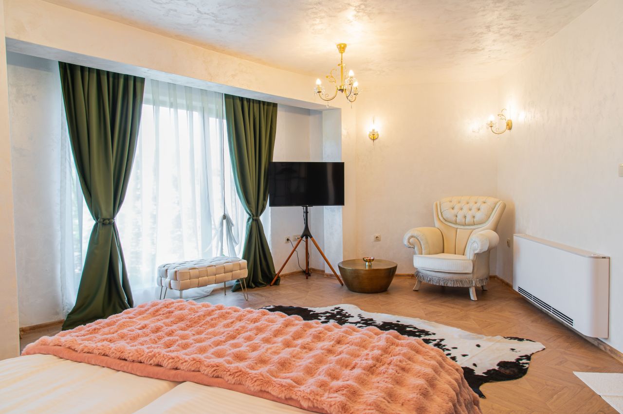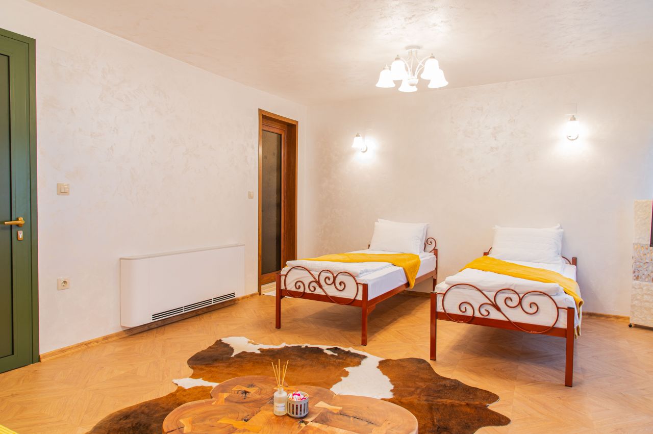 Пред хотела се намира безплатен обществен паркинг. Разполагаме с 8 двойни стаи, всяка от които е с площ от 35-45 кв.м., и разполага с двойно легло или две единични легла, както и с кът за отдих.