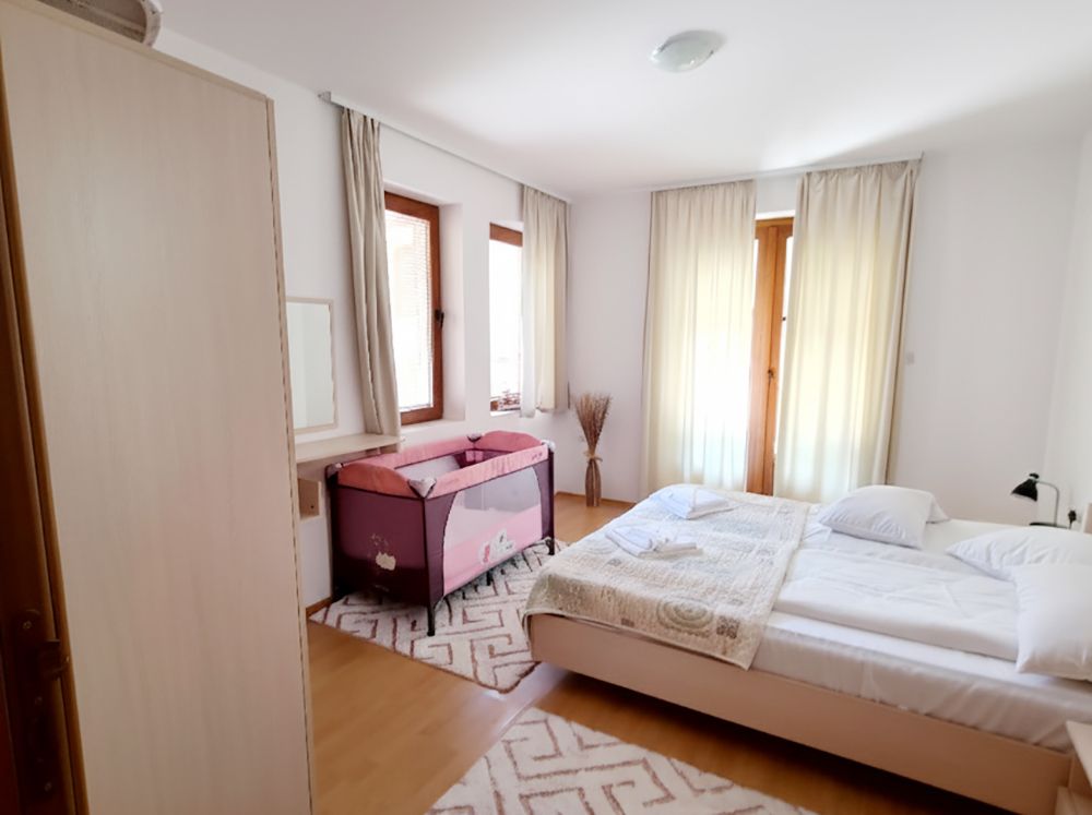 Всяка спалня разполага с големи легла, а при нужда предоставяме бебешка кошара, сгъваемо легло и детско столче – напълно безплатно. Подходящи са за семейства с деца, двойки или приятели, които търсят спокойствие и комфортна почивка в планината и в близост до писти и атракции за деца и възрастни.