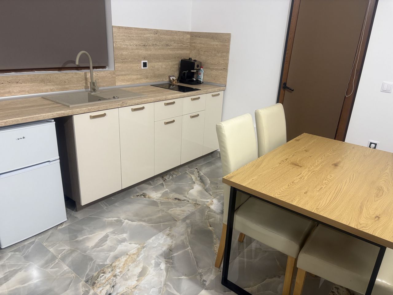 Кухнята е оборудвана с фурна, котлони, кафемашина, ел. кана, тостер, хладилник.