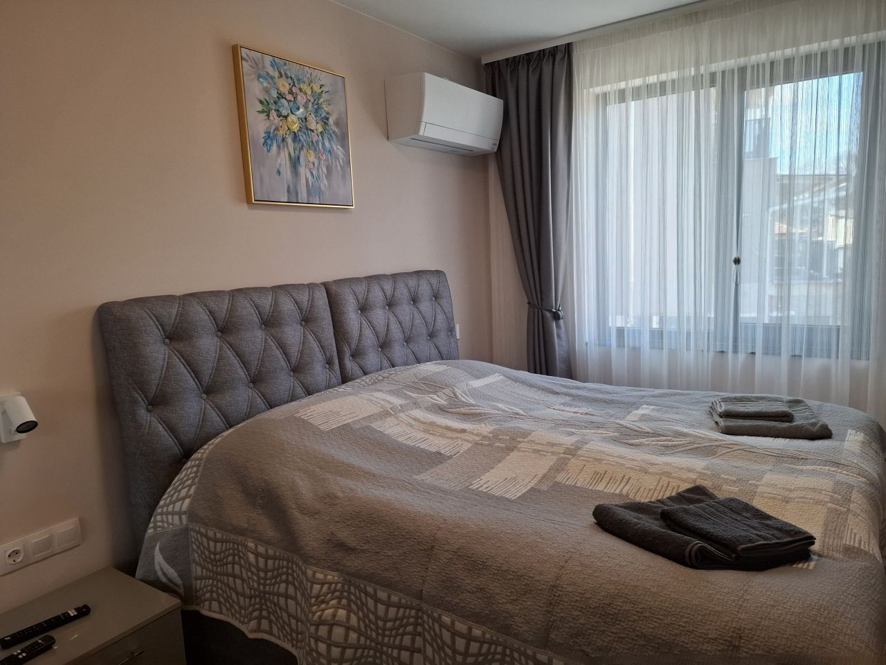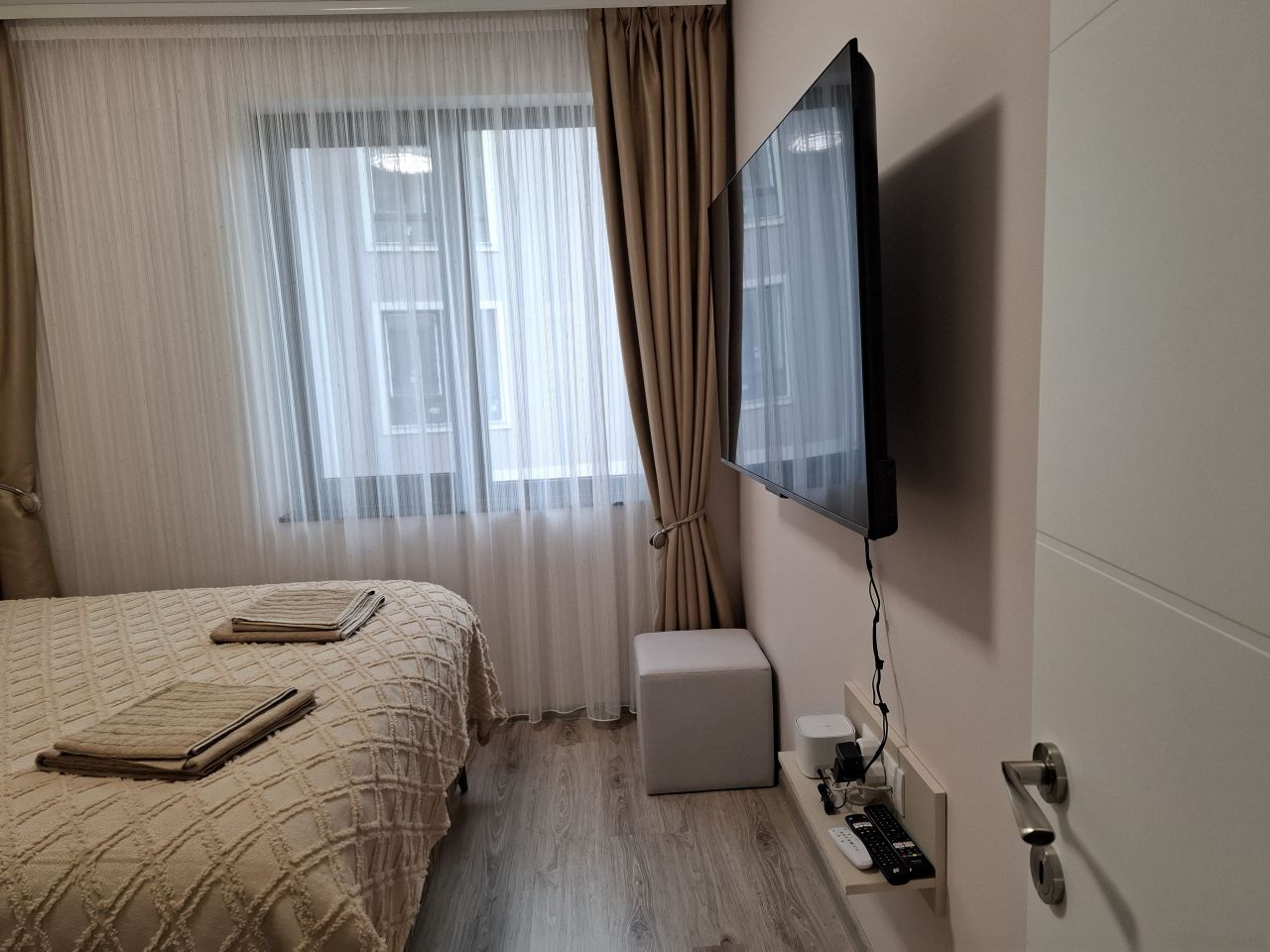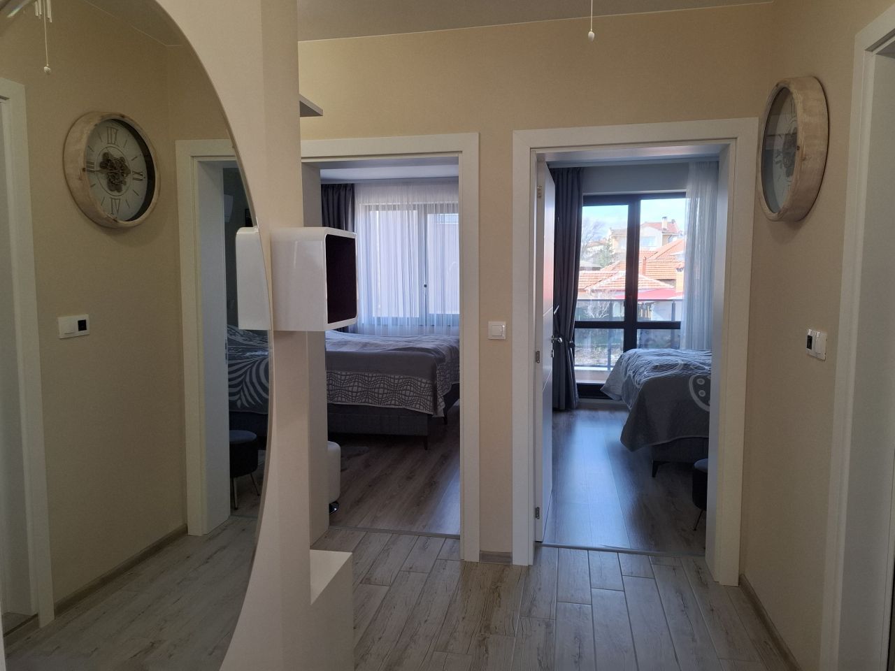 Апартамент 1 (70 кв.м) е подходящ до четирима. Състои се от две отделни спални, напълно оборудвана кухня, две тераси, три климатика, телевизор във всяка стая, безплатен Wi-Fi, самостоятелен гараж.