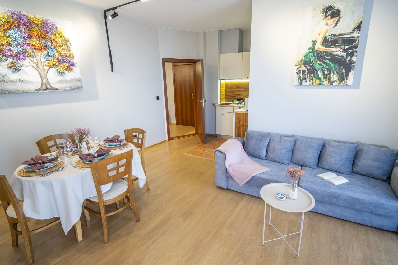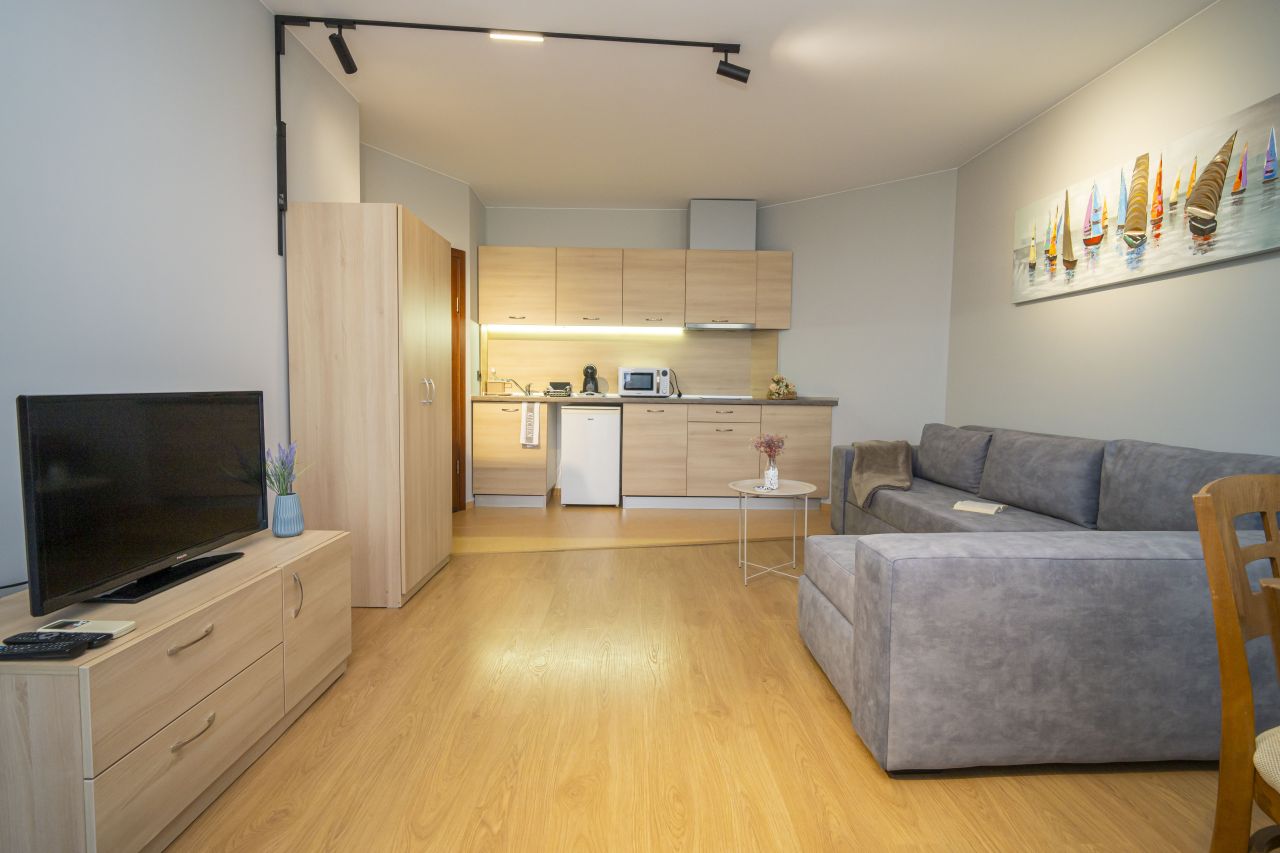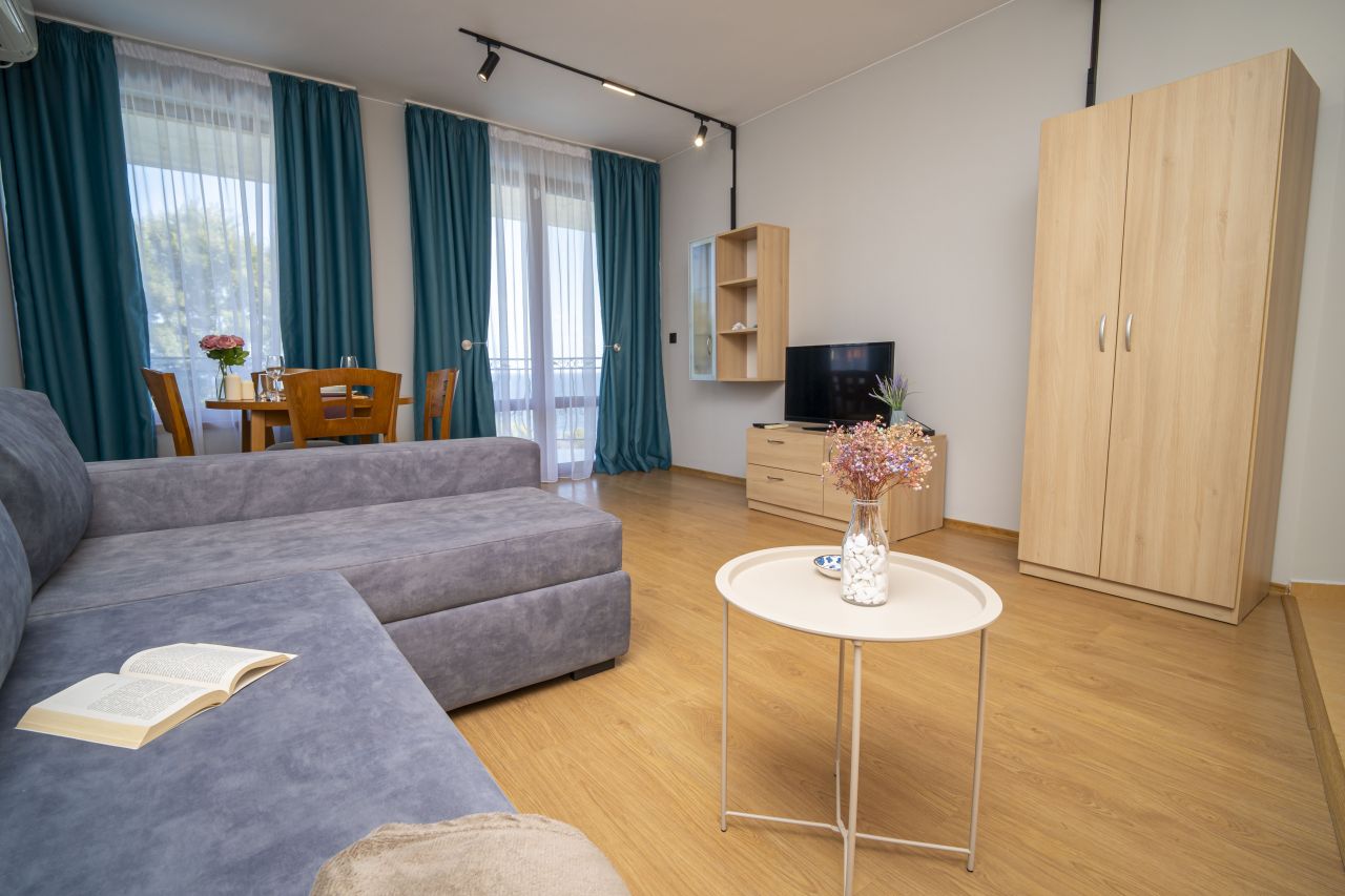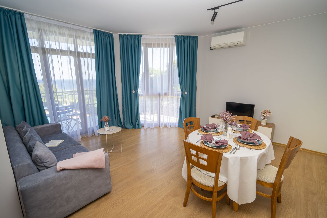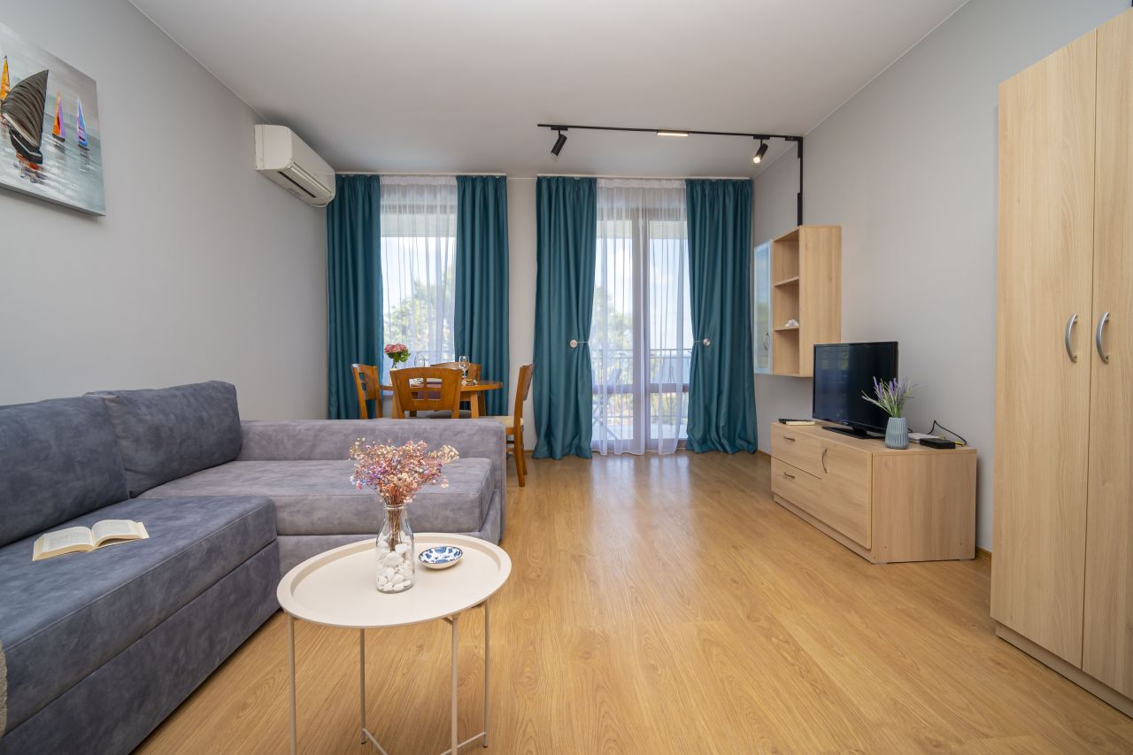 Просторни апартамента с морска гледка, 6 апартамента с една спалня, 3 апартамента с две спални и две студиа за двама възрастни.