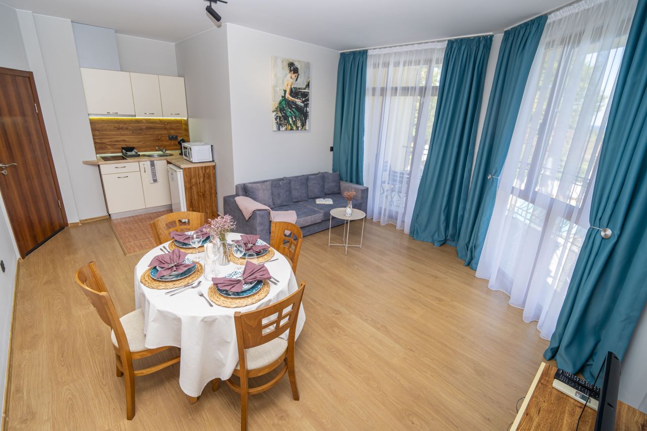 Всички апартаменти разполагат с хладилник с камера, котлони, аспиратор, ел. кана, кафе машина, телевизор с плосък екран и ТВ канали, климатик във всяко помещение, посуда за готвене и сервиране, спално бельо и хавлии и др.