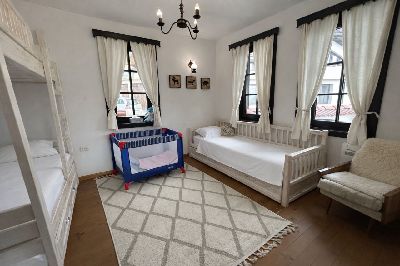 Спалня 4 - е най-подходяща за деца, въпреки че всички легла са стандартен размер за възрастни. Има едно двуетажно легло и един диван.