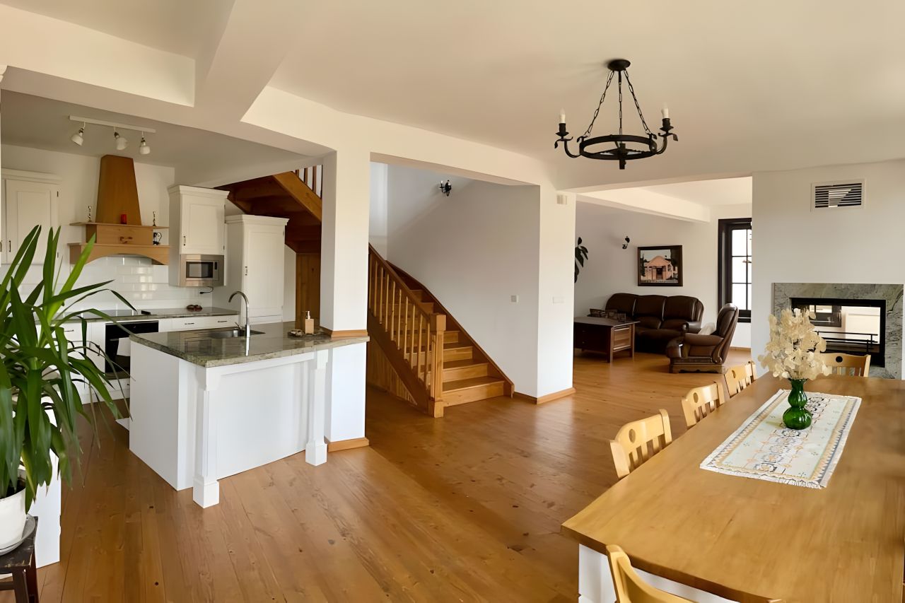 Първият етаж на къщата е изцяло отворен план, с кухня, оборудвана с всичко необходимо, трапезария и хол, както и перално помещение и тоалетна. Прекрасна атракция е двулицевата камина между трапезарията и хола. От хола се излиза на приятна тераса към двора с място за отдих.