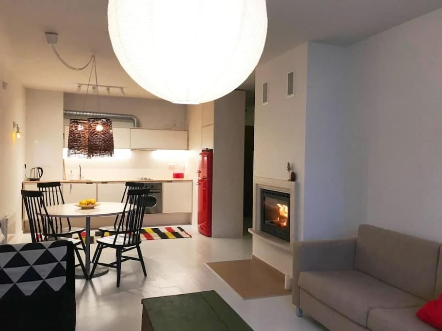 - отворено пространство, състоящо се от оборудвана кухня (вкл. кафемашина), кът за хранене с трапезна маса и 4 стола, хол с камина, 4K Smart TV с YouTube и Netflix, и разтегателен диван;
