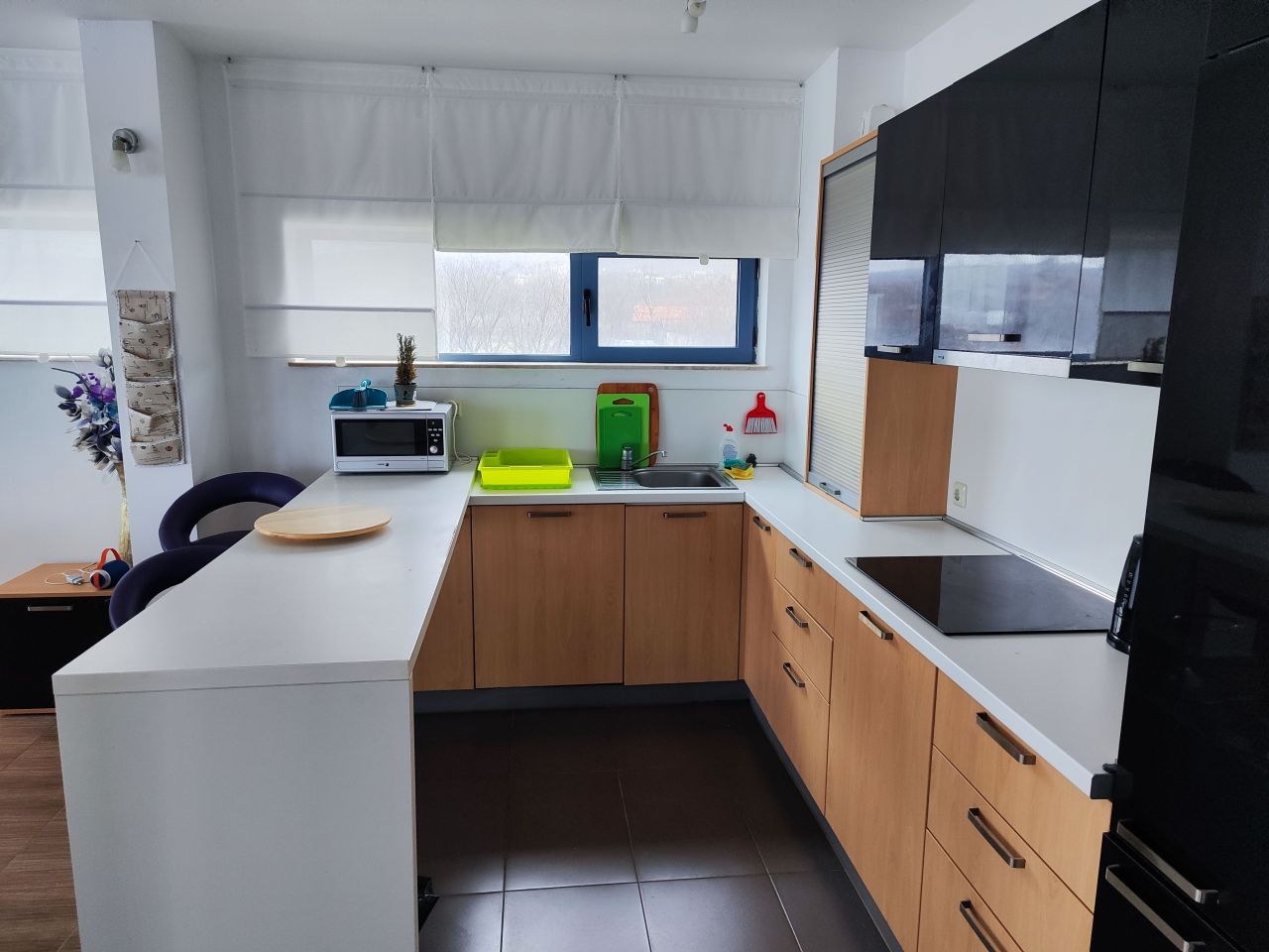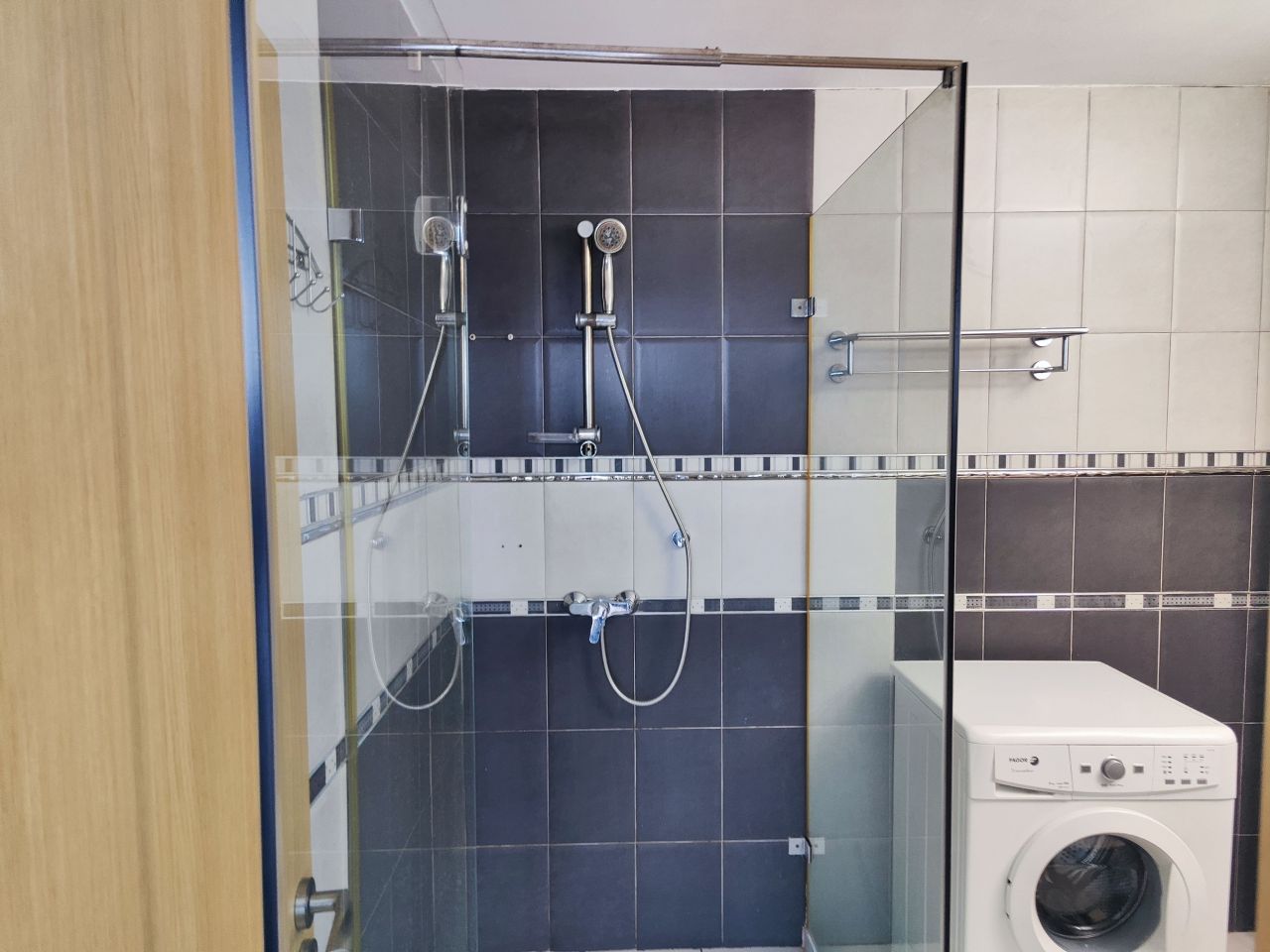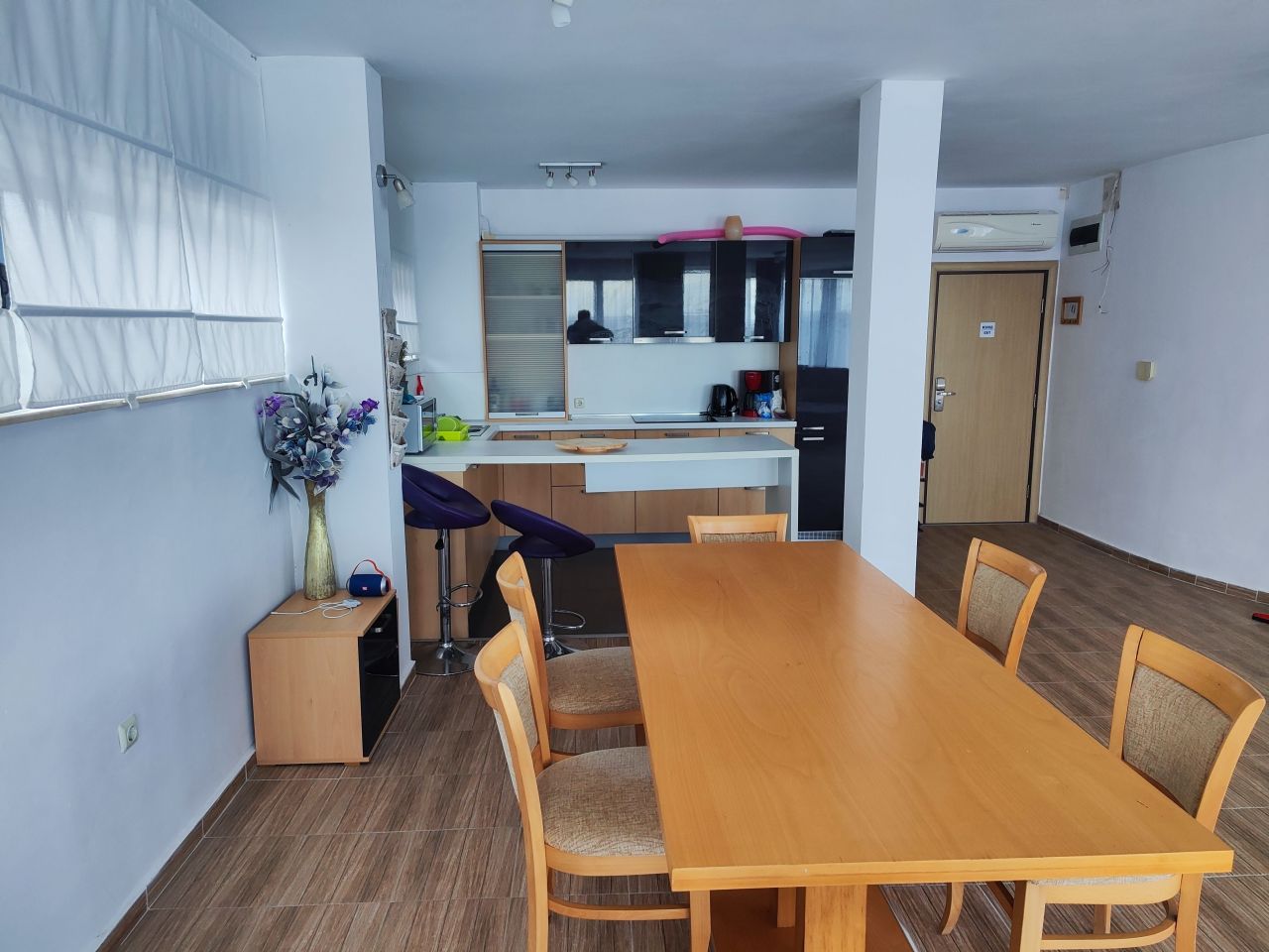 Апартаментът разполага с просторен хол с напълно обзаведена кухня, голяма трапезна маса и разтегателен диван (подходящ за спане на двама души) и голяма тераса с градинска мебел и чадър с гледка море.