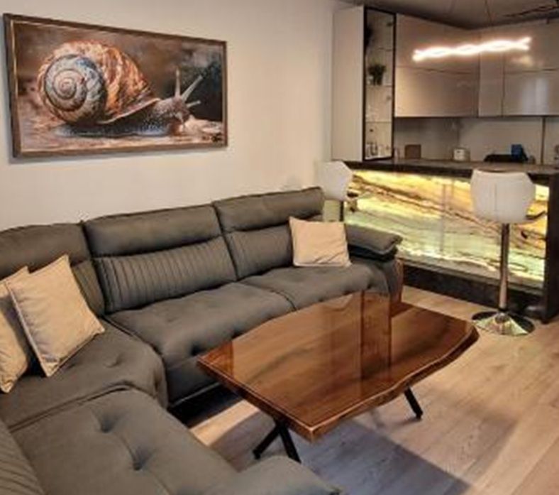 Всички мебели са изработени от естествено дърво и камък. Леглото е с мек ортопедичен матрак. Апартаментът разполага с два смарт телевизора, два климатика и два големи гардероба. Банята включва пералня, бойлер и сешоар. На разположение е безплатен подземен паркинг.