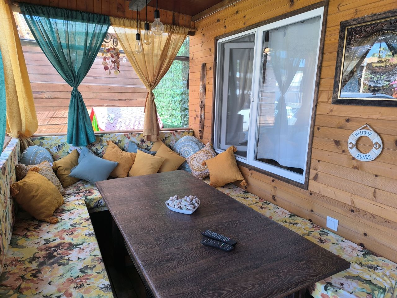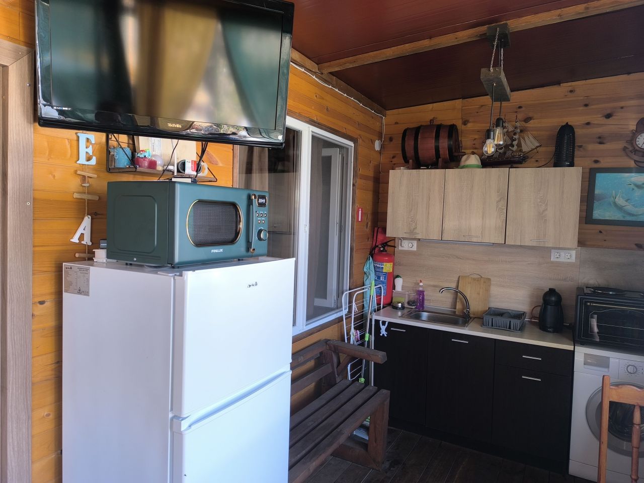 Предлагаме веранда с голяма маса за хранене, телевизор, хладилник и напълно оборудвана кухня (кафе машина, печка, термокана, микровълнова, кафеварка и пералня).