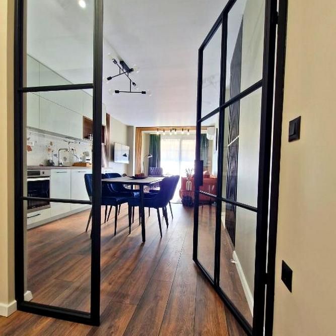 Състои се от две спални, просторна дневна зона, съчетаваща хол, трапезария и кухня ведно, уединена тераса с маса и 4 стола, елегантна баня и тоалетна.