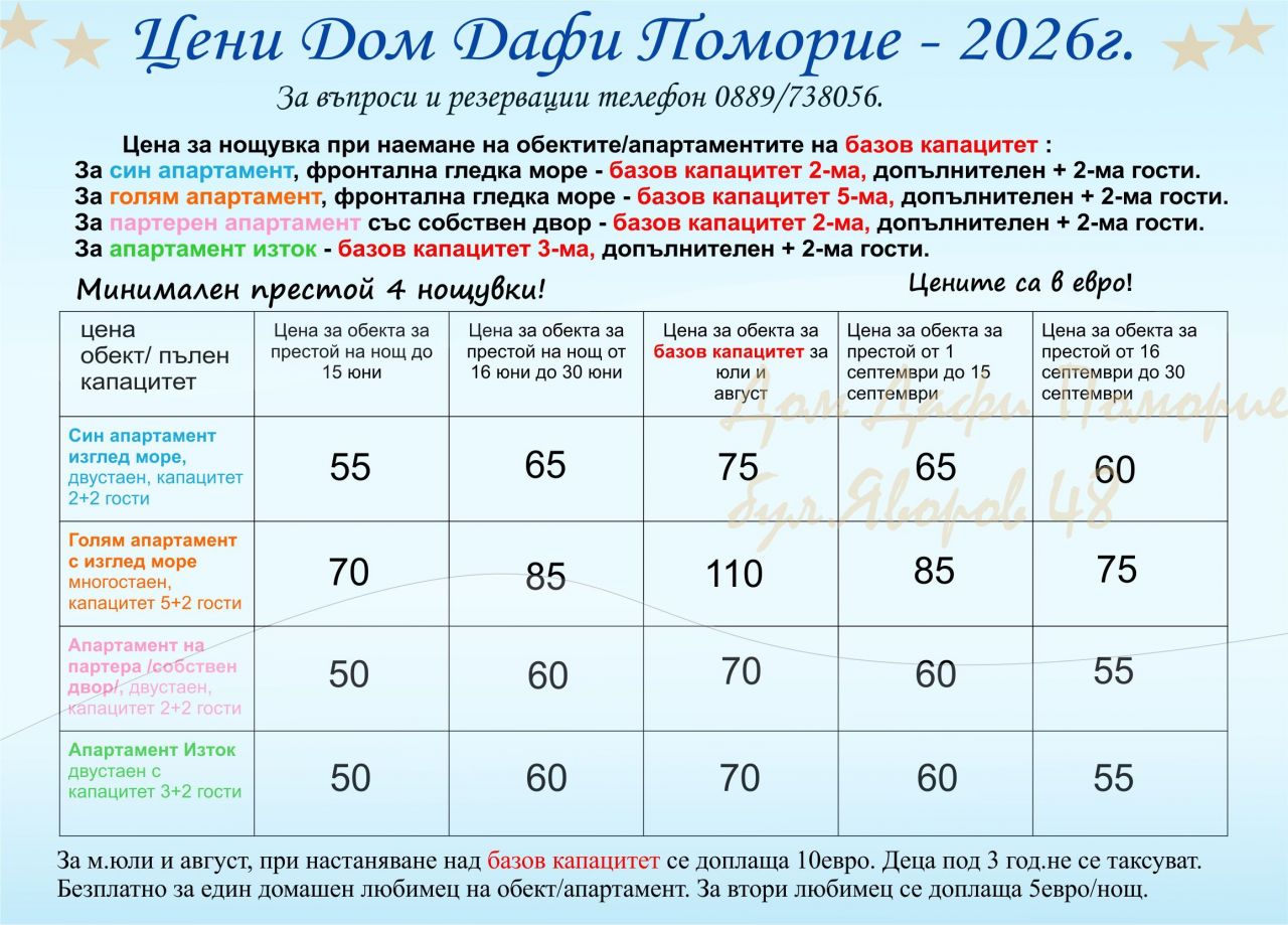 Дом Дафи, Поморие разполага с леглова база от 12 места.