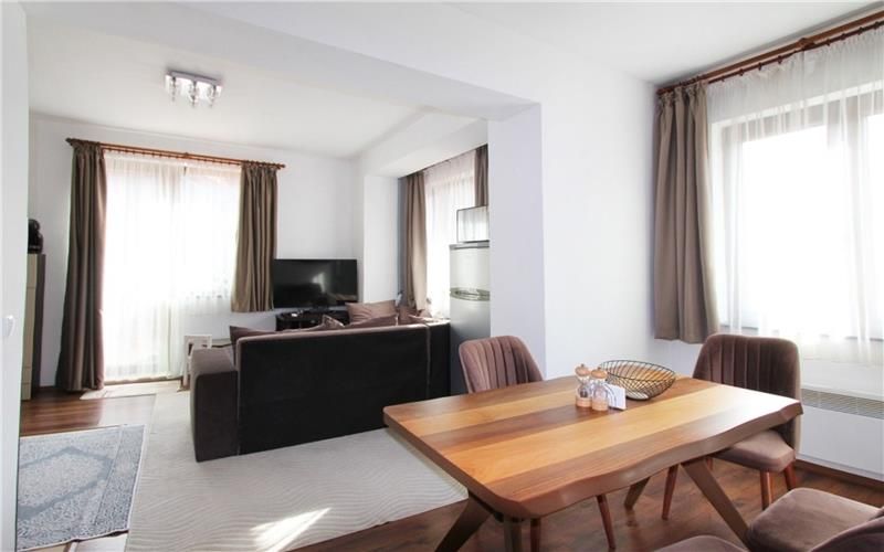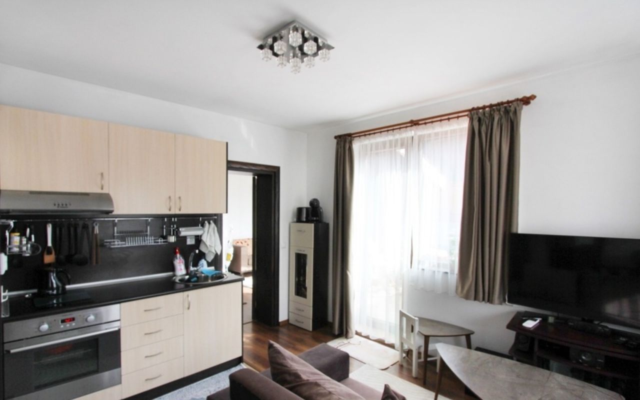 Апартаментът е изцяло с южно изложение, което осигурява естествена светлина през целия ден и приятни гледки към планината. Жилището е изключително тихо и същевременно се намира буквално в стария град – на пешеходно разстояние от градския парк, градския стадион, множество ресторанти, кафенета и исторически забележителности. В непосредствена близост се намира и големият хранителен магазин Грош.
