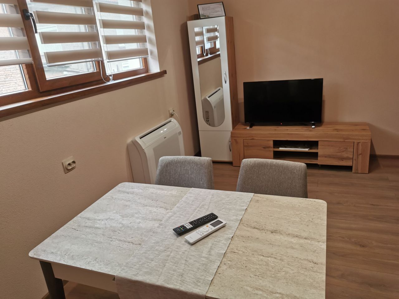 Разполага с двойно легло (спалня 160/200) и разтегателен диван с функция сън (140/190).