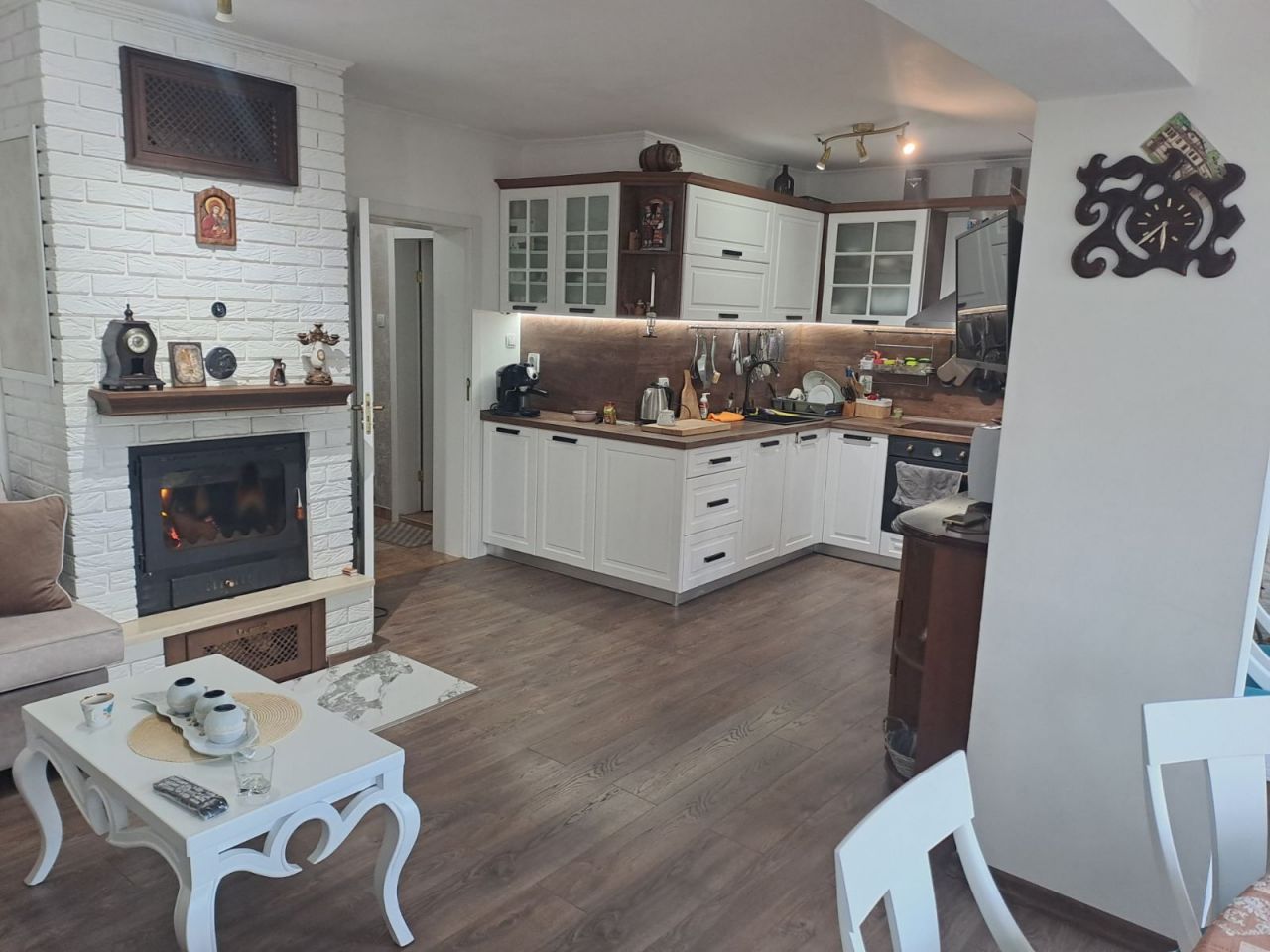 На първи етаж са разположени кухня с трапезария и обширен хол с камина и мека мебел. Кухнята е изцяло оборудвана с бяла техника и всичко необходимо за домакинството.