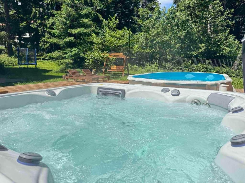 Пред вилата има голяма веранда с целогодишно работещо джакузи и външен отопляем басейн работещ от май до октомври, поддържащ постоянна температура 29-31 градуса. Около басейна е изградена площадка от естествен дървен декинг, дървени щезлонги и фотьойли. За нашите най-малки гости имаме отделен детски басейн.