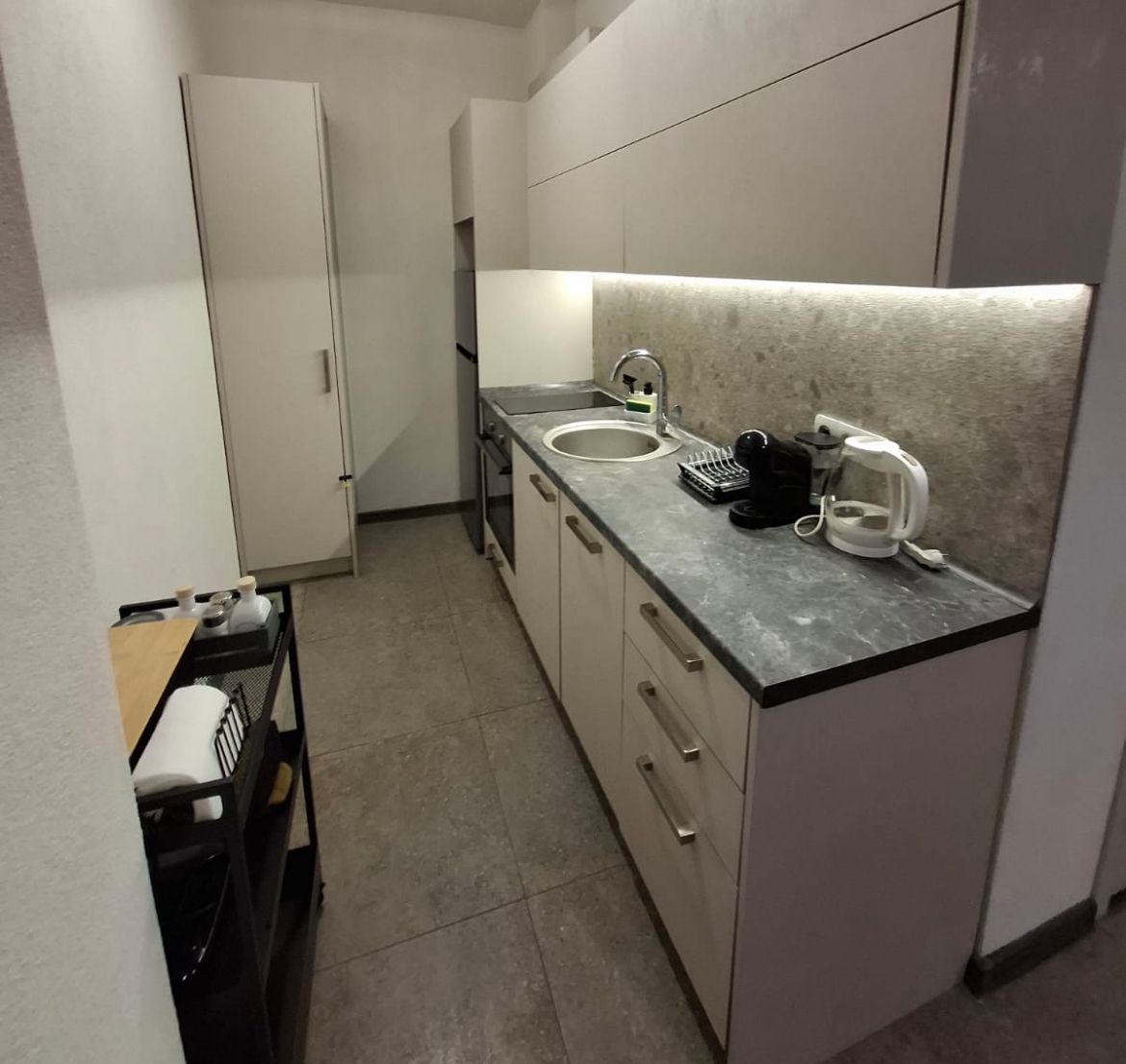 – Напълно обзаведена кухня с котлони, фурна, микровълнова, съдомиялна, хладилник, електрическа кана и кафемашина (за капсули и мляно кафе).