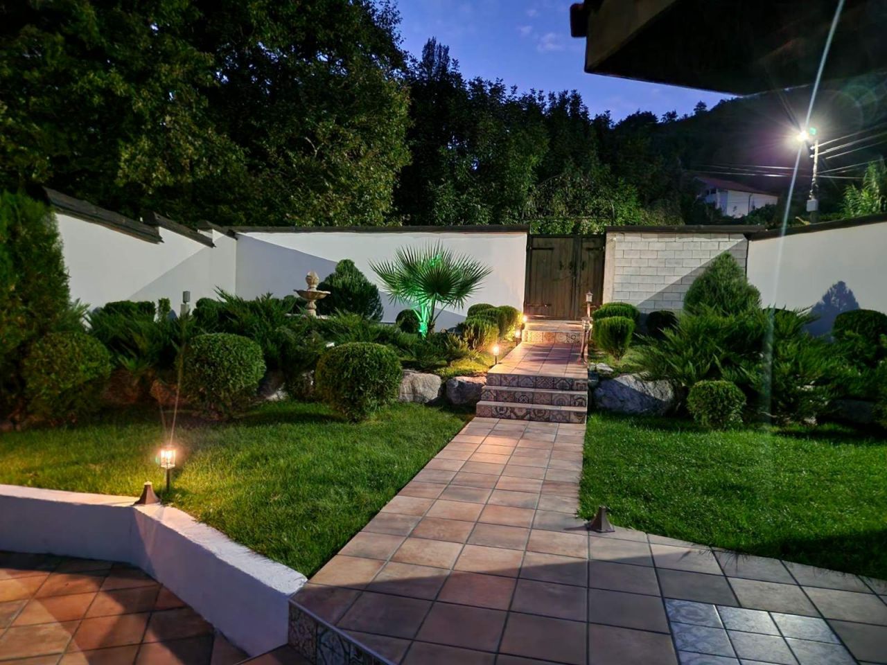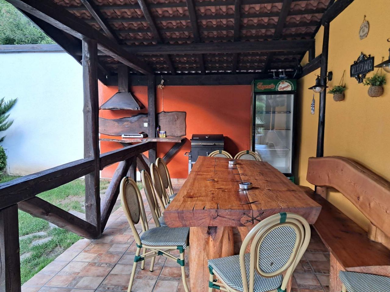Дворът е просторен и разполага със собствен басейн, тревни площи, веранда, външен навес и барбекю.