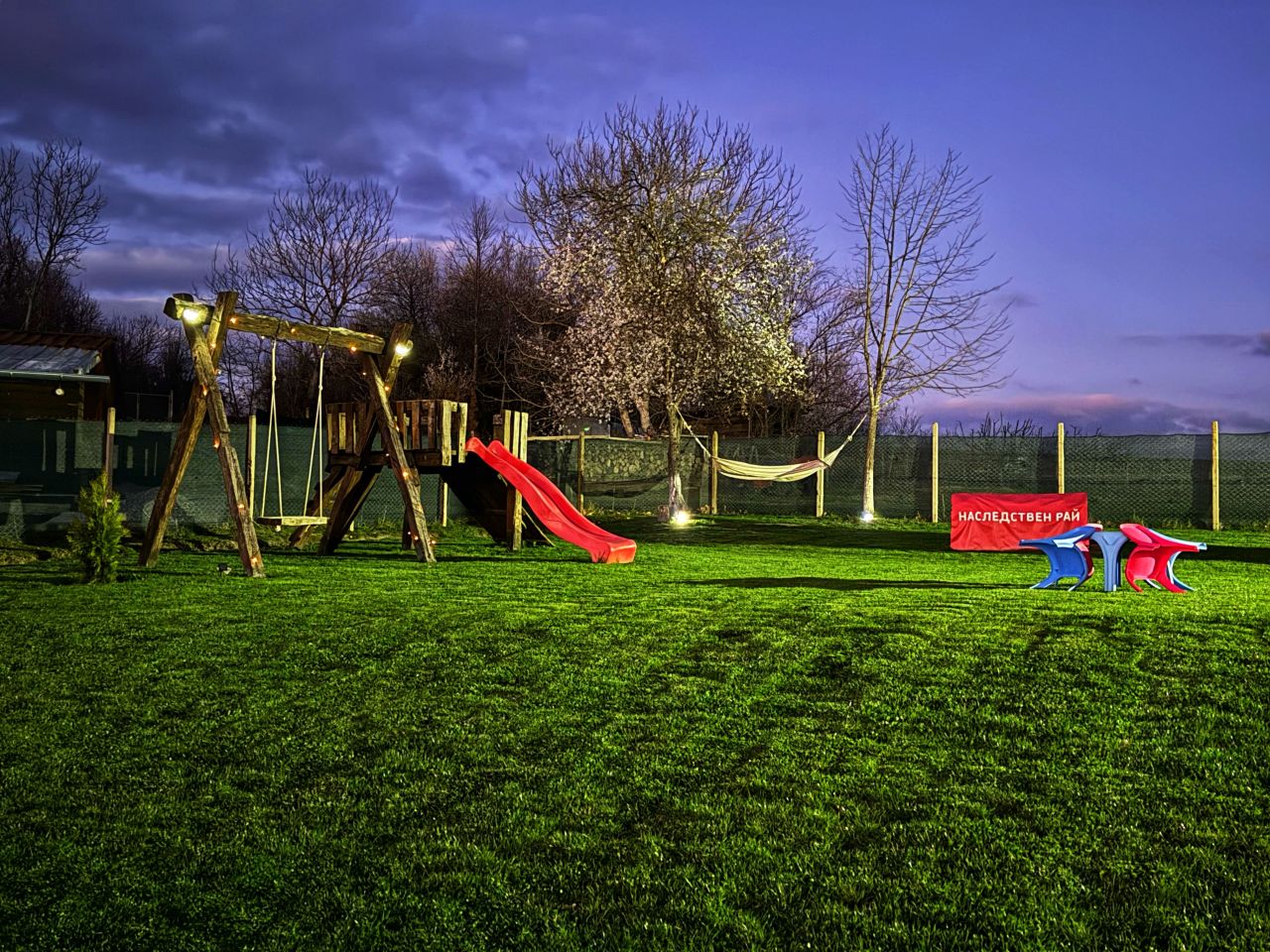 Къща за гости Наследствен рай е напълно самостоятелна и се намира в крайната част на селото. Дворът е просторен (2 дка), а гледката към Балкана - впечатляваща. Изградили сме детски кът за най-малките и голямо барбекю с кухненско оборудване за по възрастните. Хидромасажно джакузи с температура на водата 40 градуса, лед осветление и вградена блутут музика. Басейнът е неизменна част от пълноценната лятна почивка и влиза в употреба от месец юни (при благоприятни климатични условия).