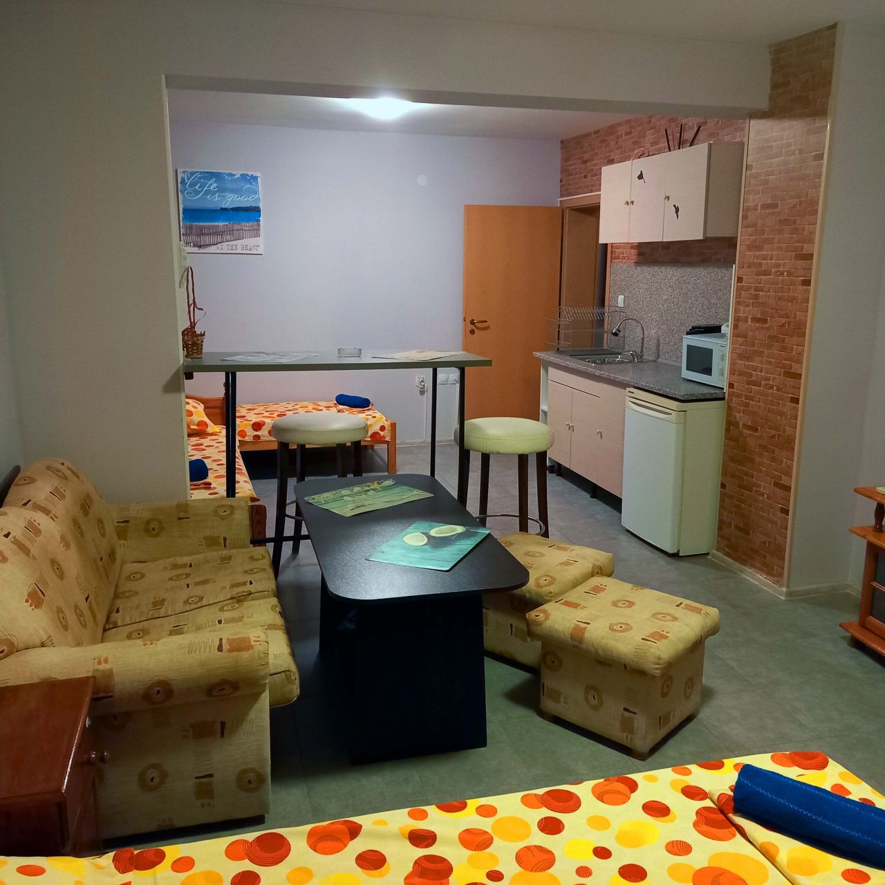 Едната е обширна стая (студио) с възможност да се настанят до четири човека - една спалня и две единични легла.
