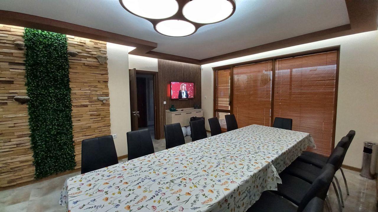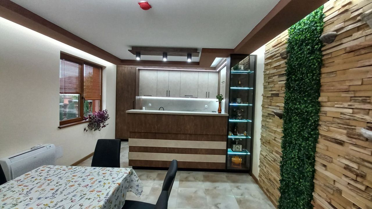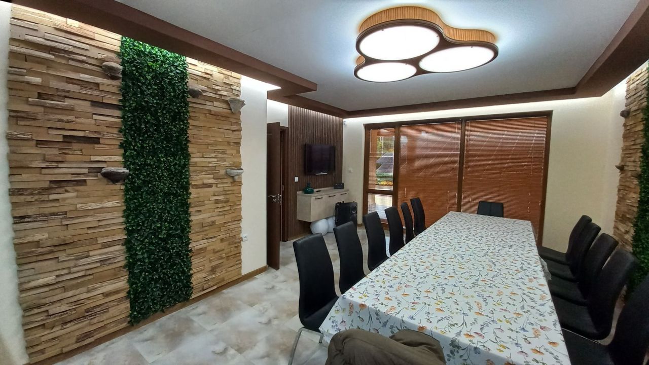 Къщата разполага 5 спални помещения, трапезария за 14 човека и напълно оборудвана кухня със съдомиялна, кафе машина, ледогенератор и още много екстри, 4 санитарни възела, пералня, сушилня, ютия.