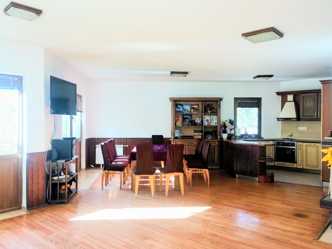 Първи етаж - голям, просторен хол, тип банкетна зала с кухненска част, оборудвана с всичко необходимо /разполага с необходимата посуда, микровълнова фурна, ел. кана за вода, кафе машина с капсули, съдомиялна машина и др./