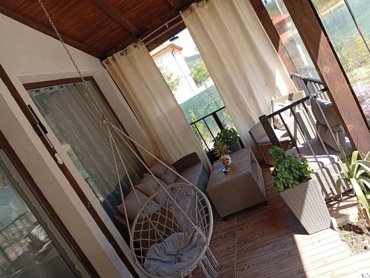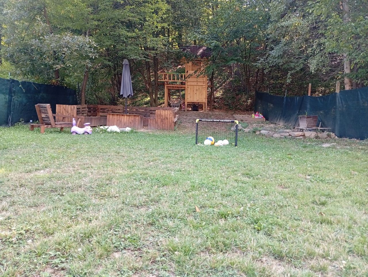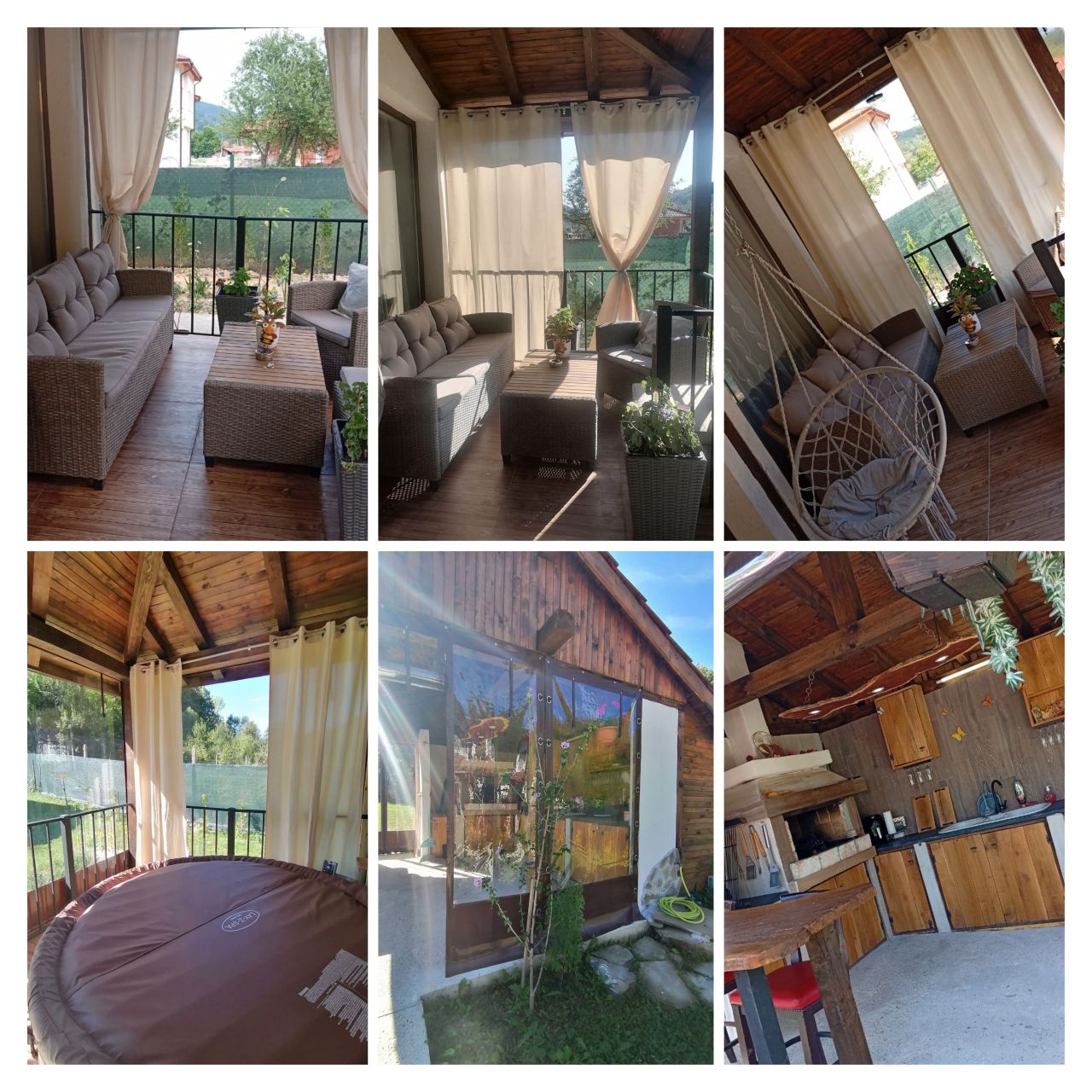 Дворът с изглед към планината допълва усещането за уединение и природа. В него ще откриете кът с градинска мебел, лятна кухня с барбекю, външна камина и детски кът.