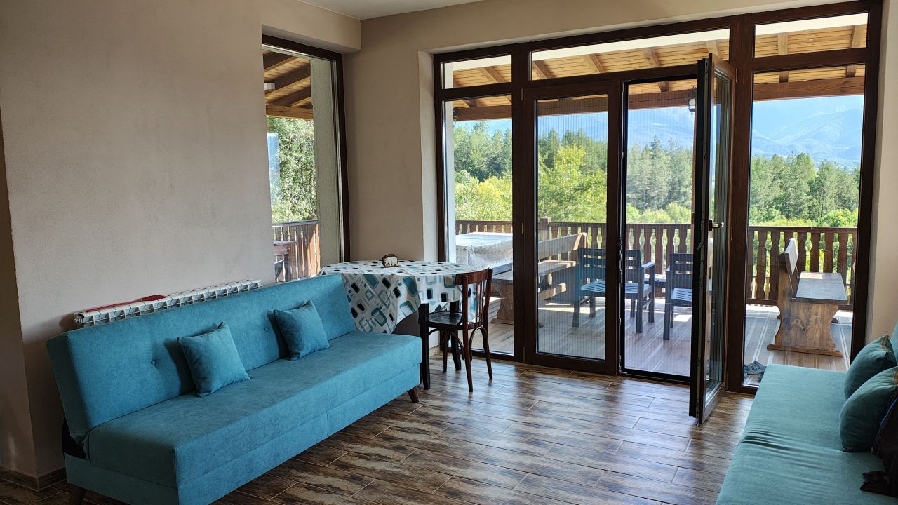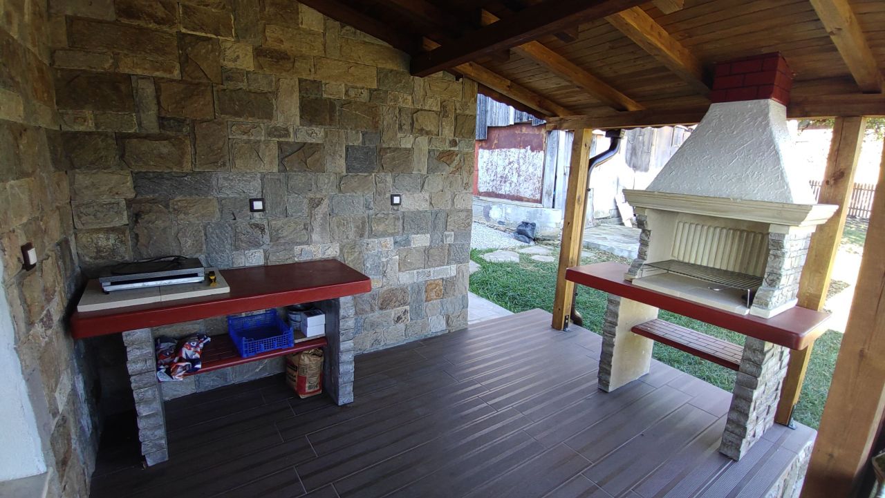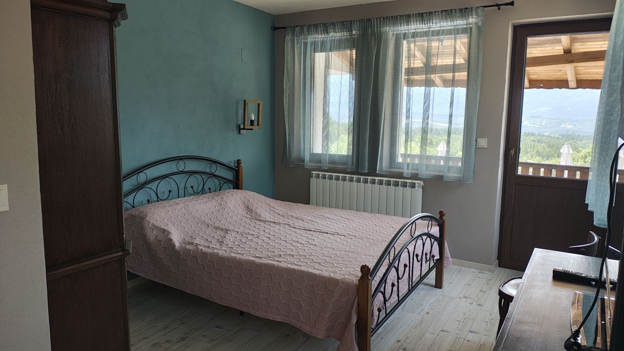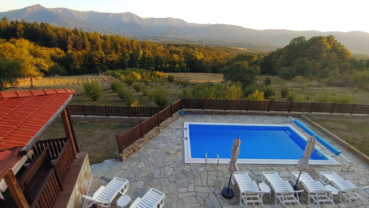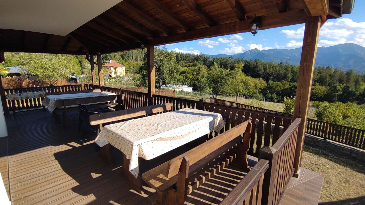 На ваше разположение е голяма трапезария и напълно оборудвана кухня – фурна, котлони, кафе машина, миялна машина и всякакви удобства за самостоятелно готвене. Навън ще откриете просторна веранда с барбекю и панорамни гледки, както и освежаващ басейн за летните дни. Мястото е перфектно за релакс и за планински разходки и приключения сред природата.