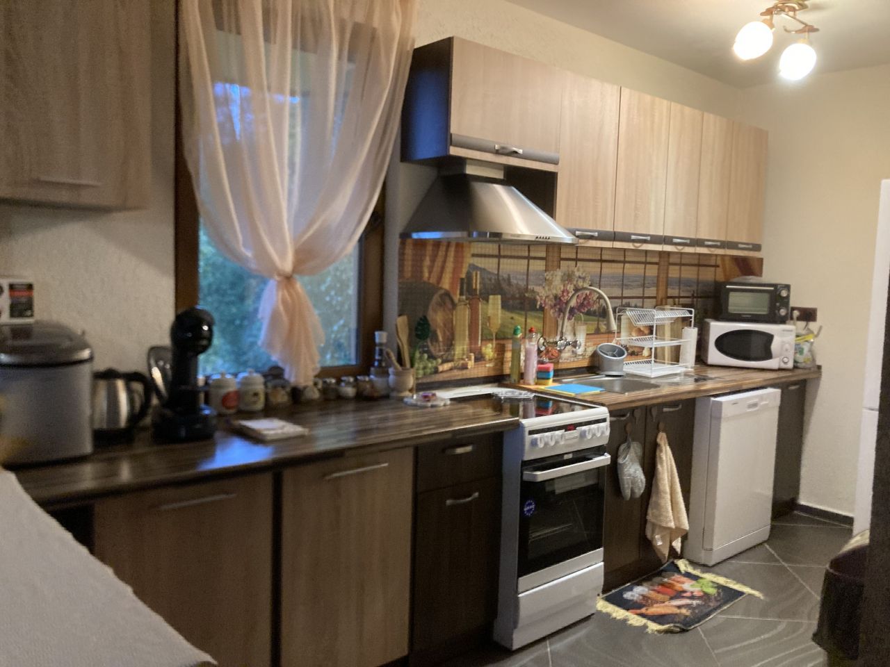 На първия етаж се намира напълно оборудвана кухня - кафе машина, ледогенератор, готварска печка с фурна, микровълнова фурна, съдомиялна, пералня, хладилник с фризер, телевизор и др.