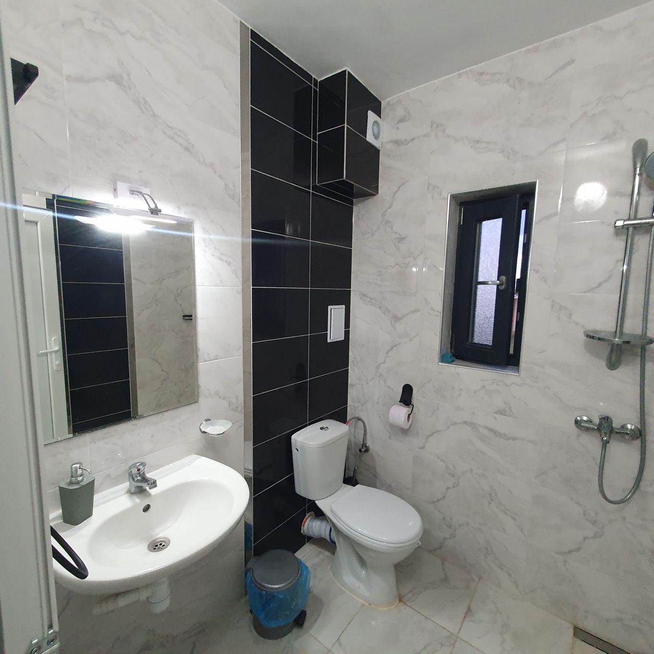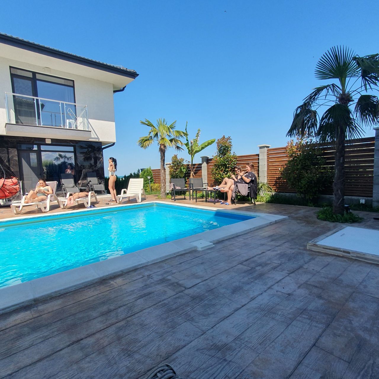В основната къща има място за 12 човека - шест спални и четири самостоятелни WC, голям модерен хол с напълно оборудвана кухня (миялна, пералня, фурна, 2 хладилни витрини, кафе машина, тостер).