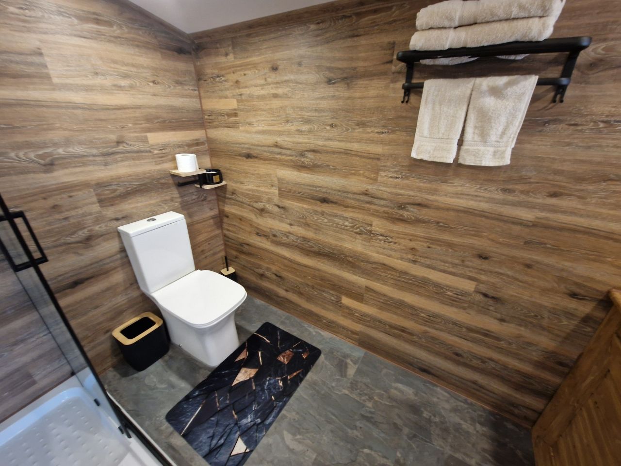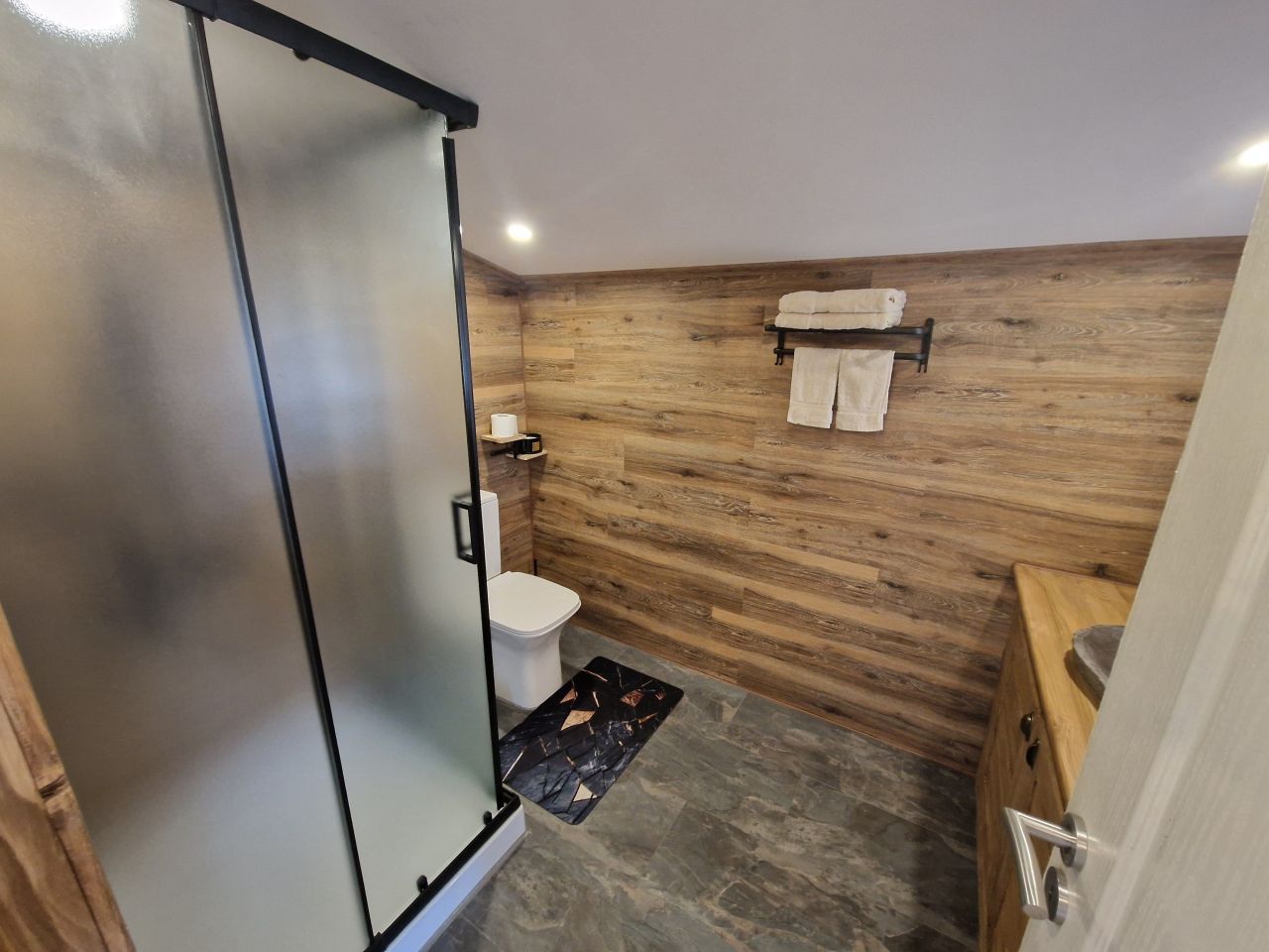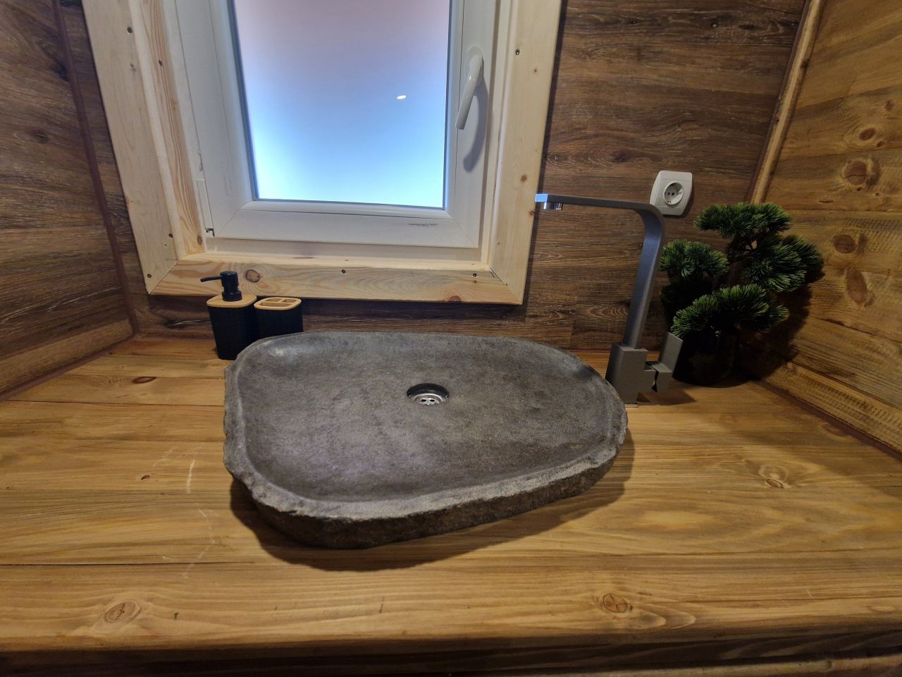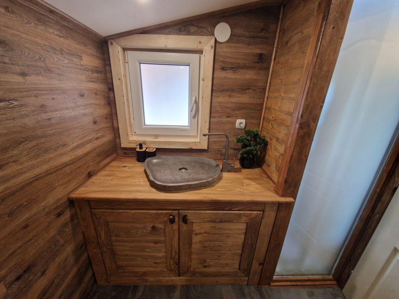 Има спалня, хол с разтегателен диван, изцяло оборудвана кухня с всичко необходимо, баня и тоалетна, външно барбекю, външно джакузи, затоплящо се с камина на дърва, паркинг с видеонаблюдение.