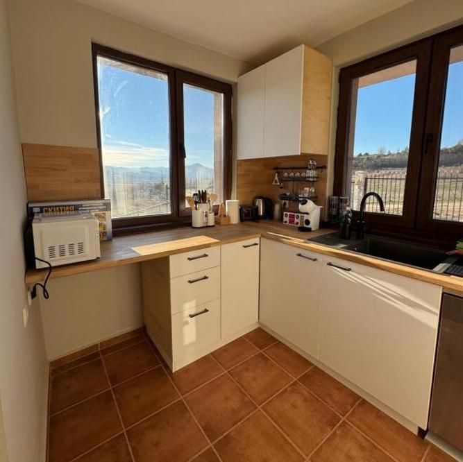 - напълно оборудвана кухня (чинии, чаши, прибори, фурна, микровълнова, хладилник, ел. кана за топла вода, кафемашина, тостер, котлони);